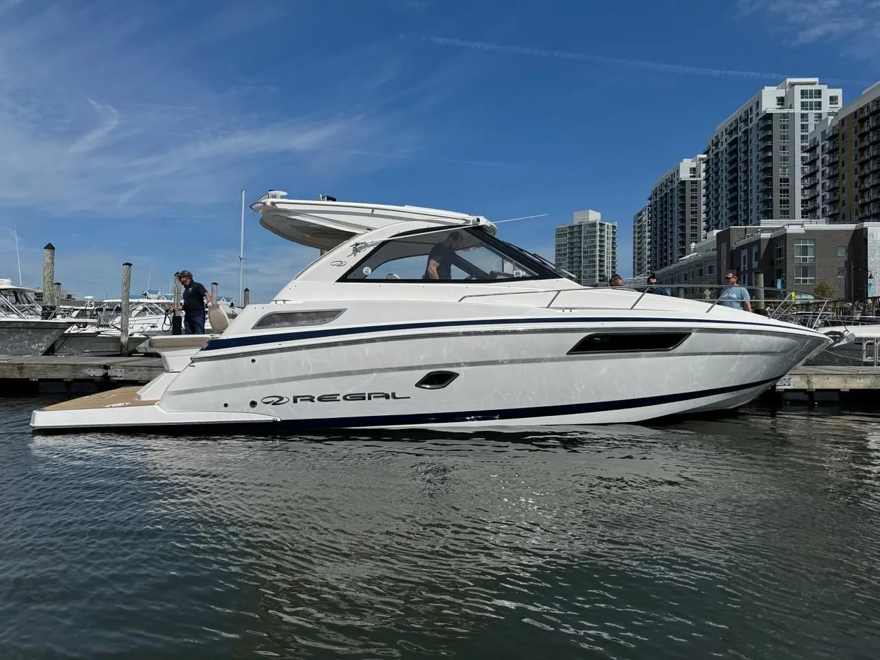 Check out this sleek 35 Sport Coupe now available and ready for a new owner. Do not miss your rare opportunity to own this 2016 Regal 35 Sport Coupe, where sport meets luxury. The 35 Sport Coupe is fast and agile and is a breeze to dock with Volvo's EVC Joystick. When you are ready to get someplace fast you will have no problem with the Twin Volvo V8 300 DP CAT JOYSTICK GEN 5 engines. New Engines by Volvo and rebuild outdrives have only 60 hours. Cruises at 30 MPH and tops out in the low to mid 40's. When you are away from the dock you can run all your equipment with the Kohler 7.5KW generator.