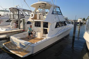 Introducing the stunning 2003 Riviera 48 Flybridge, a remarkable sports fishing boat that combines elegance with performance. With an overall length of 50.5 feet, this vessel boasts a sleek fiberglass hull designed in a deep Vee shape, ensuring stability and agility on the water. Powered by twin Caterpillar 3196 inboard engines, each delivering an impressive 660 horsepower, it achieves cruising speeds of 28 knots and a maximum hull speed of 32 knots, making it perfect for thrilling fishing adventures. The interior offers comfortable accommodations with three cabins and two heads, providing ample space for relaxation. Equipped with an electric windlass, this boat enhances convenience while anchoring. With a range of 500 miles, the Riviera 48 Flybridge is ready for extended excursions. Experience the perfect blend of luxury and functionality aboard the Buenos Aires, where every detail is crafted for an unforgettable journey on the water.
