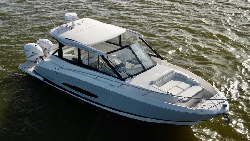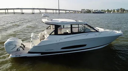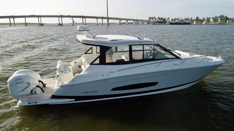 This 2021 Regal 36 XO with unmatched versatility is the total package, providing performance and space for any activity. The 2021 Regal 36 XO, offered by Galati Yacht Sales in Naples, Florida, is the ideal blend of performance and versatility for those who love to cruise and socialize on the water. Powered by twin Yamaha 425 XTO outboards, this 36-foot motor yacht reaches top speeds of 45 knots, ensuring exhilarating adventures whether you're navigating coastal waters or enjoying a leisurely day on the lake. With its sleek fiberglass construction and spacious layout, the Regal 36 XO is designed for those who appreciate both power and functionality.