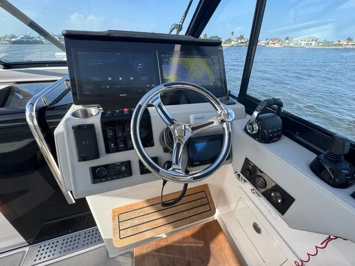 From multi-position seating to additional legroom in the aft, there’s plenty of space to spend an exciting weekend away with family and friends. The upper salon effortlessly integrates with the aft cockpit seating area for an open and seamless entertainment experience. All the controls, including dual 16” Garmin displays with Helm Master EX, Autopilot, and Joystick, are at your fingertips.