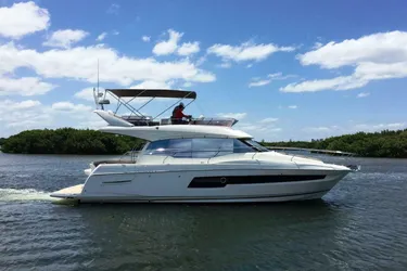 2017 Prestige 460 Flybridge For Sale. Comfortable and inviting, the 460 flybridge allows you to motor sail in a world of refinement. “Can’t Anchor Us” has many living areas including a spacious, fully equipped and comfortable flybridge for cruising with the breeze in your hair and offering incredible views wherever you go. The salon is open and immersed in light, along with a helm station, galley, and opening to a safe and comfortable cockpit where each person can while in savoring the pleasures of life onboard. “Can’t Anchor Us” has low hours, a new Bimini top, recent services, and is detailed inside and out and waxed. She is ready! Also has two fresh pods which were installed about 2 years ago, turnkey and ready to go!