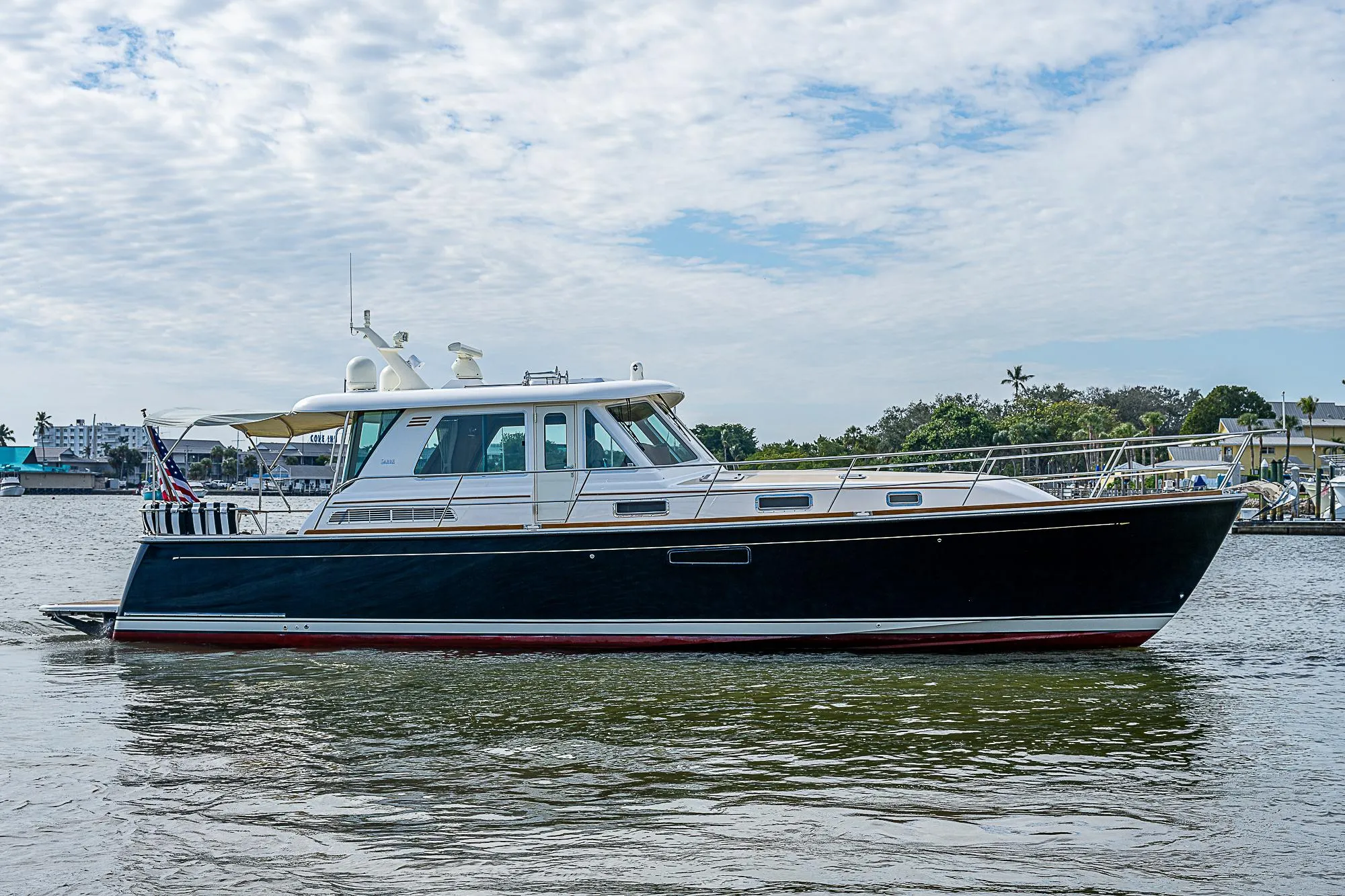 Screens on all opening ports. Ocean Air screen/blinds on deck hatches. Ocean Air pleated blinds on side windows and side door Drapes on aft curved windows Hull Modified Deep “V” Planing hull design, with shallow pod drive tunnels. Rub rail with stainless steel cap.  Deck Hardware 1 1/4" Diameter type 316 stainless steel perimeter rail system.  (8) 12” Stainless steel cleats (2 fwd, 4 mid ship, 2 in aft cockpit). (1) 10” Stainless steel cleat to starboard of windlass as anchor rode tie off. (4).  (2) stainless steel mooring cleats aft.  Bow pulpit with dual anchor roller.  Quick anchor windlass, electric rope-chain type.  Flag staff and socket on taffrail. Burgee staff on bow pulpit.  Remote control battery switches with controls at helm.  Manual emergency battery crossover switch. Illuminated main circuit breaker distribution.  Digital battery monitor.