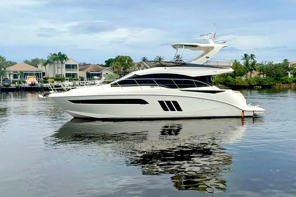 The 2016 Sea Ray 510 Fly is a 51ft flybridge yacht prized for its spacious, social layout, luxurious accommodations, and solid performance. Its "SkyFlow Design" and integrated cockpit and salon create a large, seamless entertaining area.