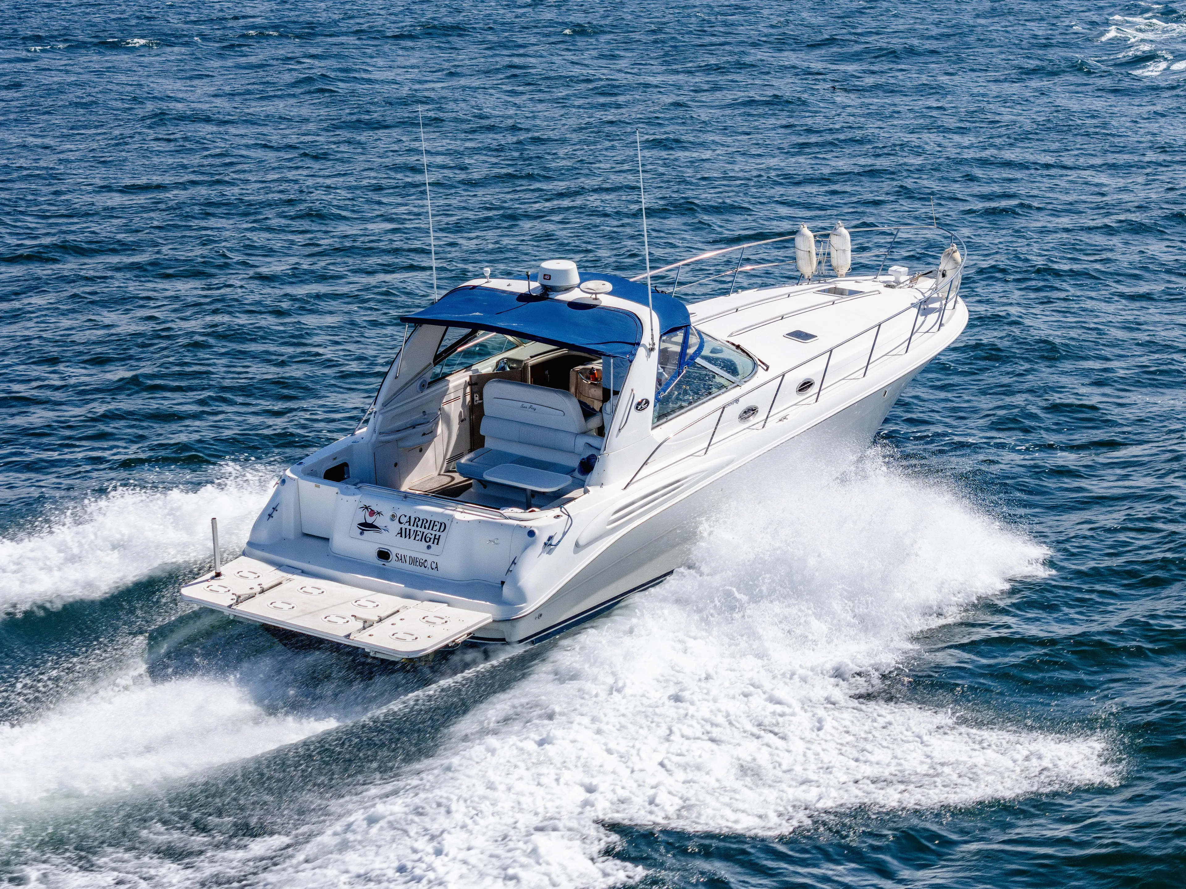 Long on styling and loaded with cruising amenities, the Sea Ray 400 Sundancer set the class standards in her day for sport cruiser luxury and elegance. She’s built on a deep-V hull with a solid fiberglass bottom, a moderate beam, and prop pockets to reduce the shaft angles of her V-drive CAT diesel engines. The spacious interior floorplan of the 400 Sundancer is arranged in the conventional manner with the owner’s stateroom forward, an open galley to port in the main cabin, and a mid-cabin stateroom/settee with a sliding privacy door for guests. You'll note that there’s a second head adjoining the mid-cabin settee conversion — a very desirable bonus feature for an express of this size . The forward head has a stall shower with seat, and the level of fit and finish throughout is second to none. Topside, the huge U-shaped cockpit lounge will seat a small crowd, and the entire aft section of the cockpit sole rises electrically without moving the aft seat for engine access. Expansive helm layout with double seating next to the captain's chair. Foldaway boarding steps, a radar arch, and a transom storage locker were standard.