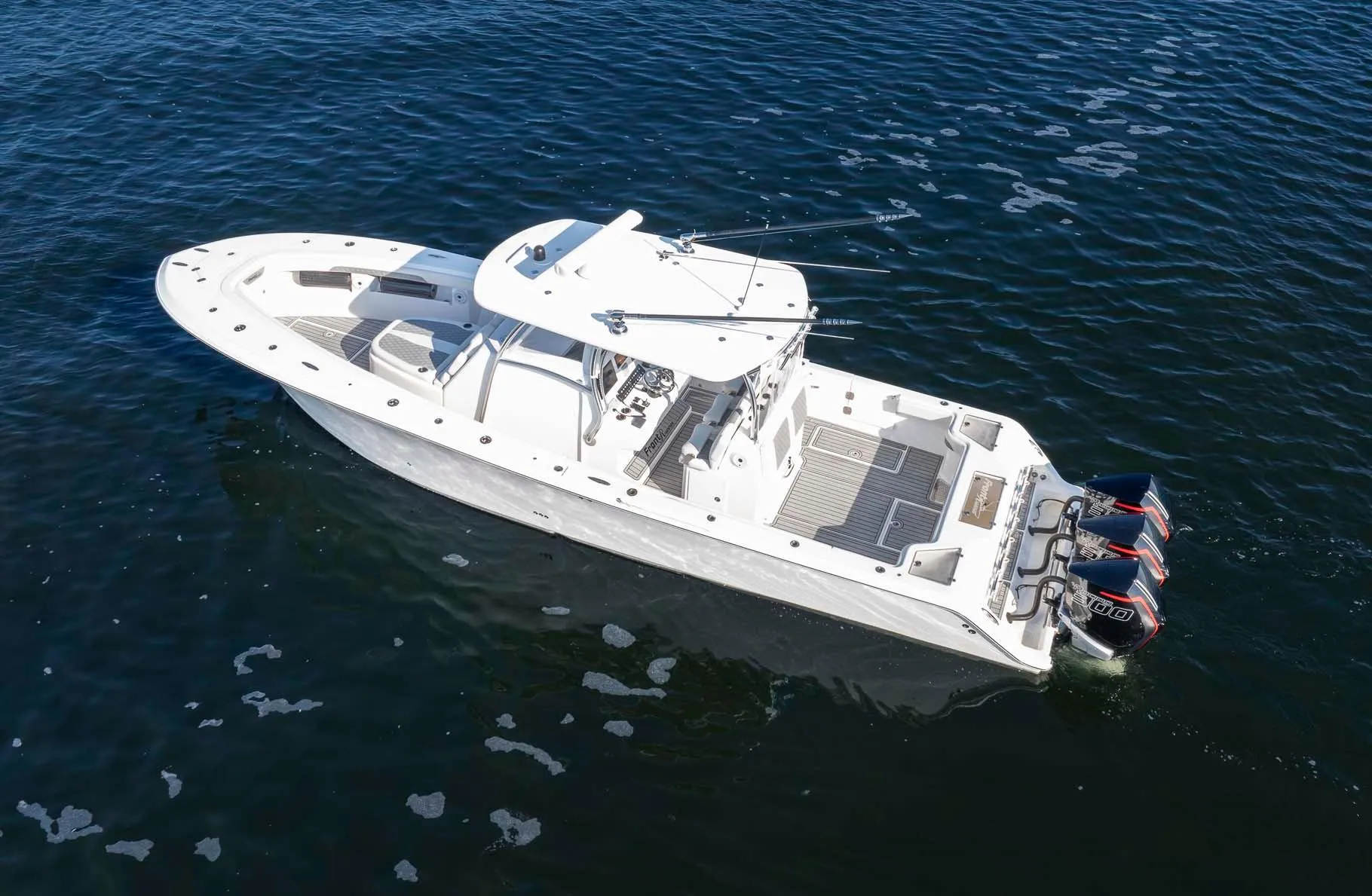 At 36'6", and a 10'6" beam, she is bigger than most other boats in her class. Sporting a deep V, big flared bow, and high-performance step bottom, she will run further and faster than others in her class. She also will allow plenty of shade and cool air in her center console cabin. Equipped with a stand-up head, shower, large berth, and optional air conditioning, she is as accommodating as many boats that are much larger.