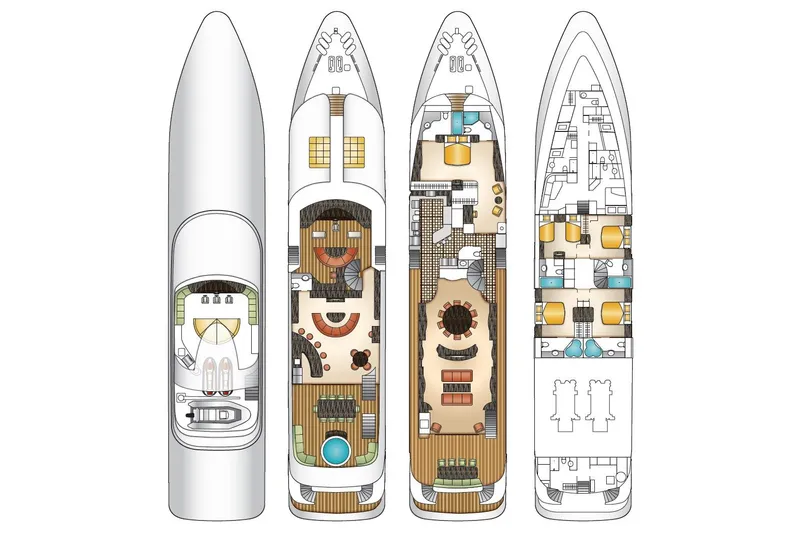 The main salon offers ample seating and boasts a large formal dining area forward with round table seating for up to ten. The enormous sky lounge and the adjoining aft deck is a favorite place to hang out, with large screen TV, formal bar, under-cover dining table and open air hot- tub.