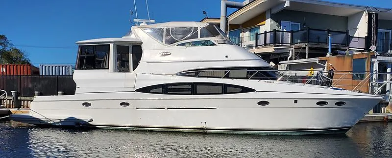 This second owner is ready to sell to you. Power from twin inboard optional BIGGEST Volvo D12 675 hp diesels with shafts provides 18 to 21 knot cruise, with 1,200 hours, fully serviced. Her three stateroom and three head layout provides private comfort. Master bath features a bathtub with shower. Sleeps 8 people. The wide beam makes a great room of the salon. Full galley includes an oven. Genuine dining area with round dining table and four chairs. Her aft lower cockpit makes entertaining and entry easy plus the raised cockpit enables comfort with protection plus doors for fresh air with great views. Climate control in flybridge, aft deck and throughout the interior. Dual side boarding gates. The flybridge enables superior sight lines plus lounges for guests and sensational views. Kohler 23 kw generator with 1,900 hours, has inverter. Cruise 7 knots consuming just 8 GPH.