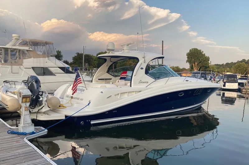 This Immaculate, turn-key, freshwater since new 2008 Sea Ray 44 Sundancer has a large, comfortable cockpit, extended lift platform with fold flat dingy davits and a luxurious two (2) stateroom and two (2) head interior creating the right formula for endless summer fun. A wealth of instrumentation is at the captain's fingertips, and twin 8.1 S Horizon MerCruiser® 8.1 S 370 hp gasoline V-drives will get you to any destination with ease. The beautiful, efficient, galley includes a host of conveniences that will make each on-the-water excursion thoroughly enjoyable.