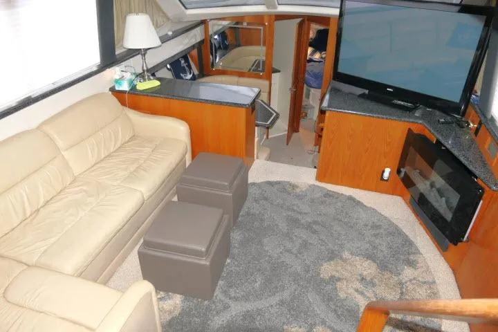 CODE FOUR has been meticulously maintained by the current owner who is a Boatyard Manager. In General, the Carver 406 Aft Cabin Motor Yacht is beautifully finished with teak wood cabinetry and Corian counters throughout. She has a wide-open interior with large windows which keep her light and airy. The spacious aft deck equipped with a refrigerator/ice maker and washer/dryer provides for even more comfort aboard.
