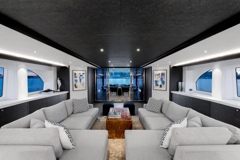 Natural light floods the interior through the yacht’s large panoramic windows, highlighting the clean, modern design and refined craftsmanship. High-quality joinery, luxurious fabrics, and tasteful soft furnishings create an inviting and sophisticated atmosphere throughout.