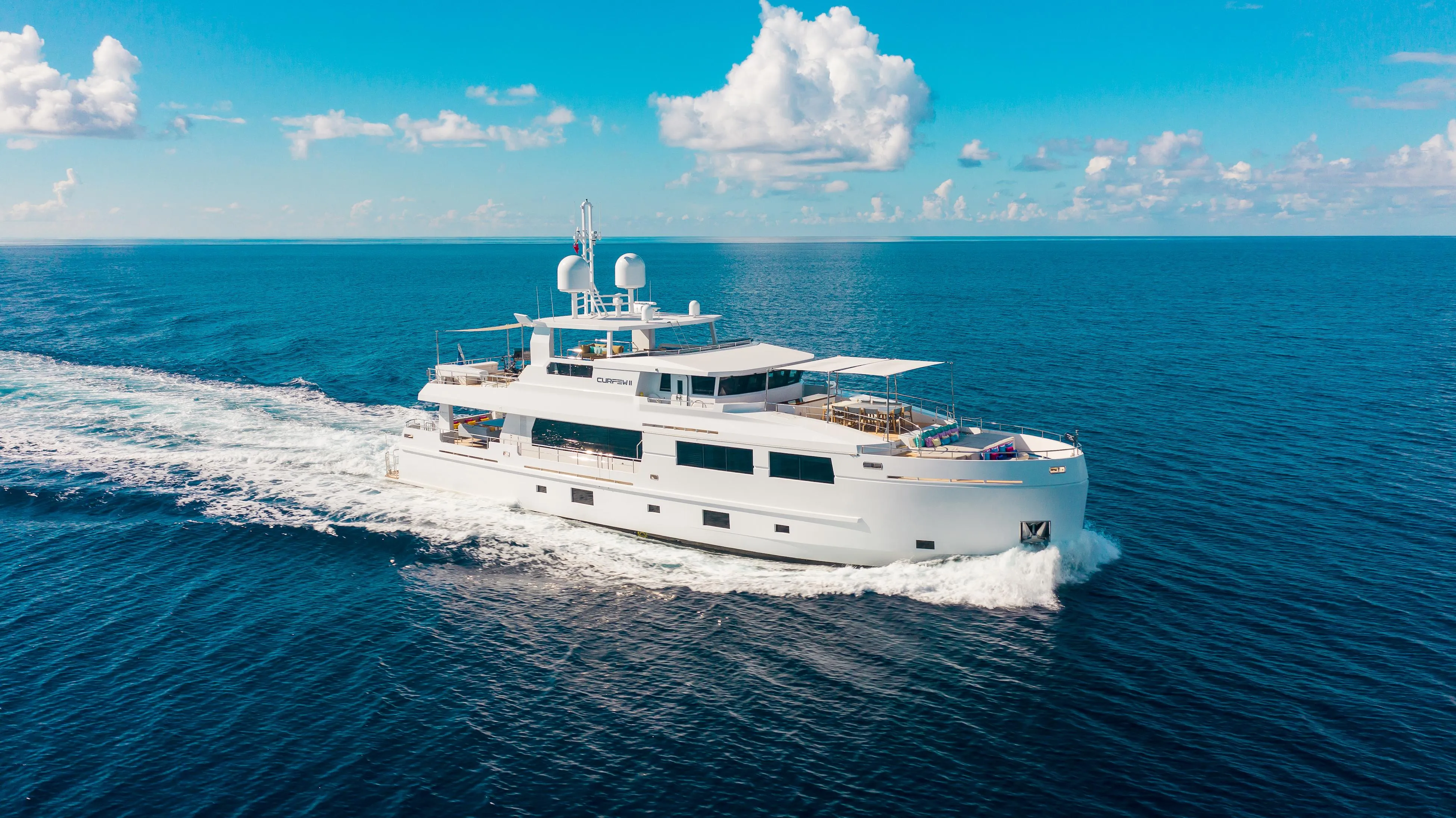 CURFEW II is a multifaceted motor yacht, with multiple indoor and outdoor deck spaces, giving her guests a true at-sea experience. Outside, vast areas are flexible, with some for gathering groups, or more intimate and quiet settings. Inside, she’s fresh and brightly lit thanks to oversized windows that allow the outside, in. With a bold, modern design and décor, she is welcoming, warm, and expansive.