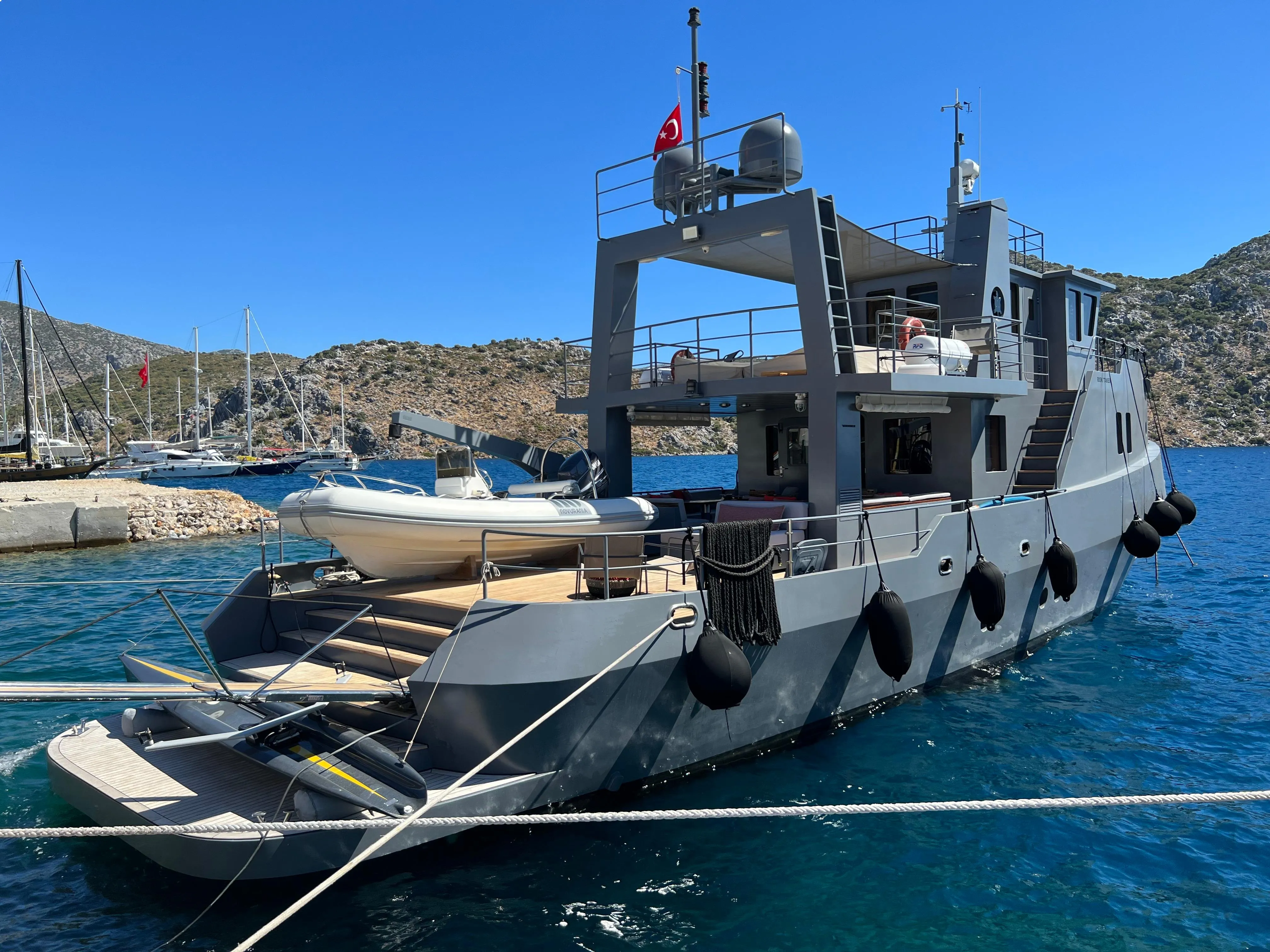 The CV70 is a 23-meter displacement motor yacht (trawler), originally built by Tansu Yachts in 2006 and extensively refitted in 2022. During the refit, a platform was added to extend its length, and the yacht was repainted in an elegant grey. Built with a sturdy steel hull, CV70 is designed for long-range cruising, powered by twin Cummins CTA 8.3 M1 engines (255 hp each), reaching a cruising speed of 9.5 knots and a maximum of 11 knots. With accommodations for five guests and crew quarters, along with enhanced amenities, it combines both luxury and reliability for extended ocean adventures