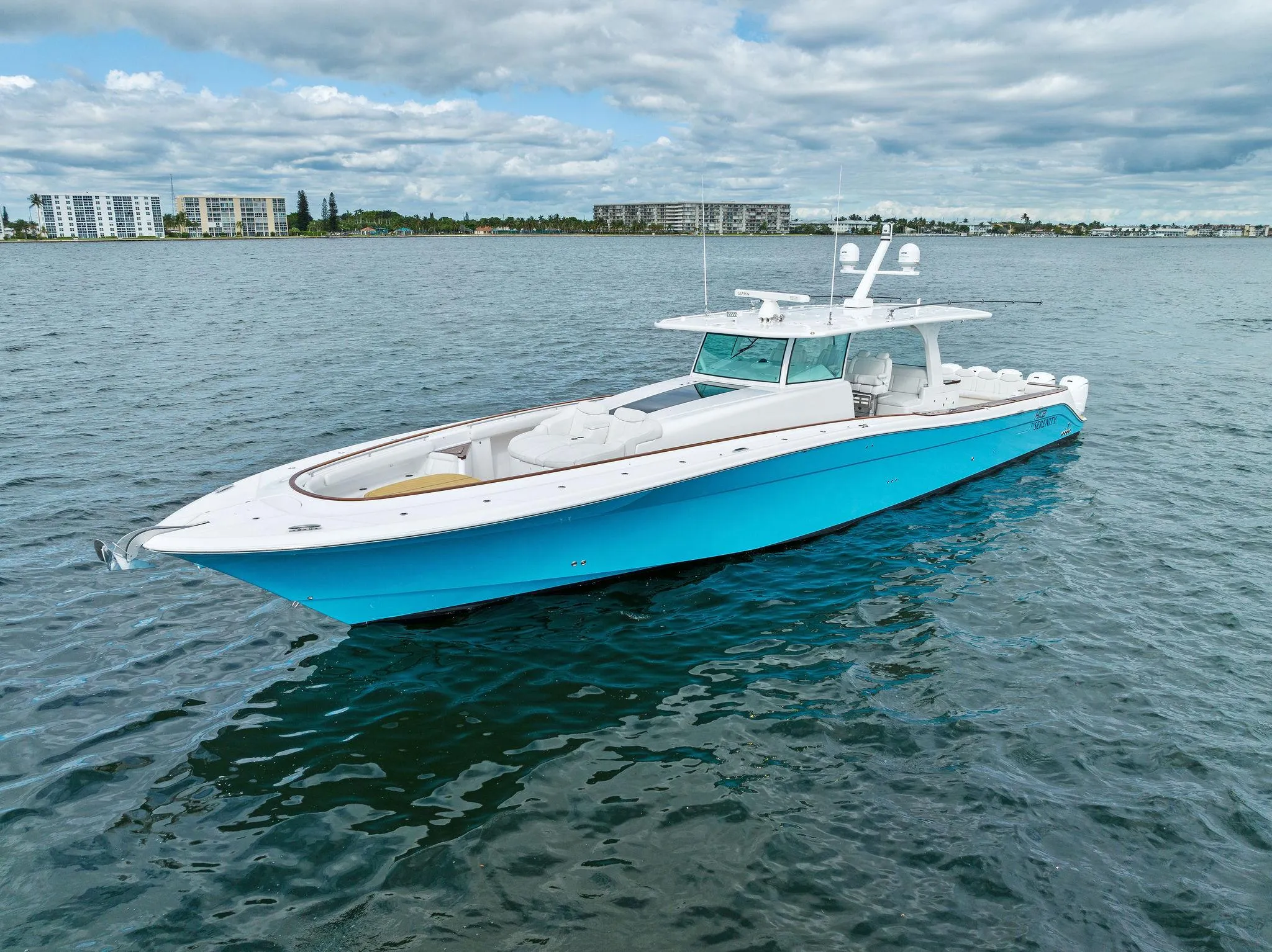 The Estrella has all the comfort and styling of any sportfishing or cruising yacht in its class, but far surpasses them in versatile use and performance. Powered by quint Yamaha (425) outboard power, you are ensured a more enjoyable ownership experience due to ease of use and manageable maintenance. And the ride and performance are unmatched, the yacht is easier to control than competitor’s twenty-five-foot models. There is an unimaginable amount of comfort and space aboard with a huge cockpit, a cabin that is twice as large as other center consoles, standard bow and stern thrusters, and large 1,500 gallon fuel capacity for long range. The five-person forward facing helm seats overlook three large Garmin® screens and have great line-of-site over the bow, they also can be rotated 180 degrees to form a 10-person express dining area with the five-person sleigh seat, all under the hard top. The cabin boasts sleeping for up to five persons with large master stateroom, convertible settee, and spacious bathroom with separate walk-in shower. There is a comfortable European inspired bow seating area and deluxe front lounge for those wishing to sun worship. And aft is a customizable rear mezzanine seating area with a variety of feature configurations. Finally, for the mechanically inclined there is a walk-in machine room where everything is within reach and out of the elements. For the perfectionist, the Estrella is an impeccably conceived and artfully crafted Mega Center Console Yacht giving you high-class luxury and comfort without sacrificing performance.