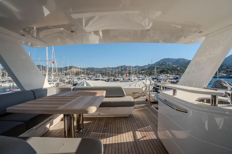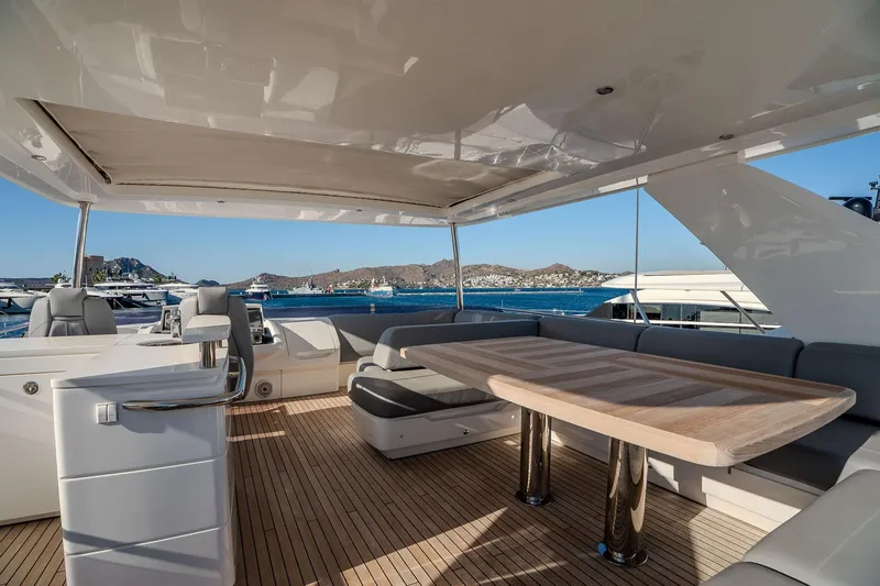 A spacious teak-laid cockpit leads into the saloon on a single level, supported by wide side decks and a hydraulic bathing platform suited to tender handling or water access. The flybridge benefits from a hardtop with an opening panoramic roof, ample lounging space, a wetbar with sink and grill, and dedicated dining. A tender crane is fitted aft. Additional deck equipment includes electric mooring winches, cockpit table with cover, and a hydraulic gangway.