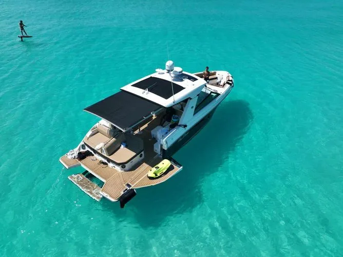 This 2021 Sea Ray 400 SLX features a strong option list. Powered by twin Mercruisers 8.2 liter HO MAG BR3X stern drives with approximately 250 hours, the boat is in excellent condition and has been kept out of the water. Located in Miami, it offers a versatile layout ideal for entertaining, day boating, and extended time on the water, with the build quality and ride Sea Ray is known for.
