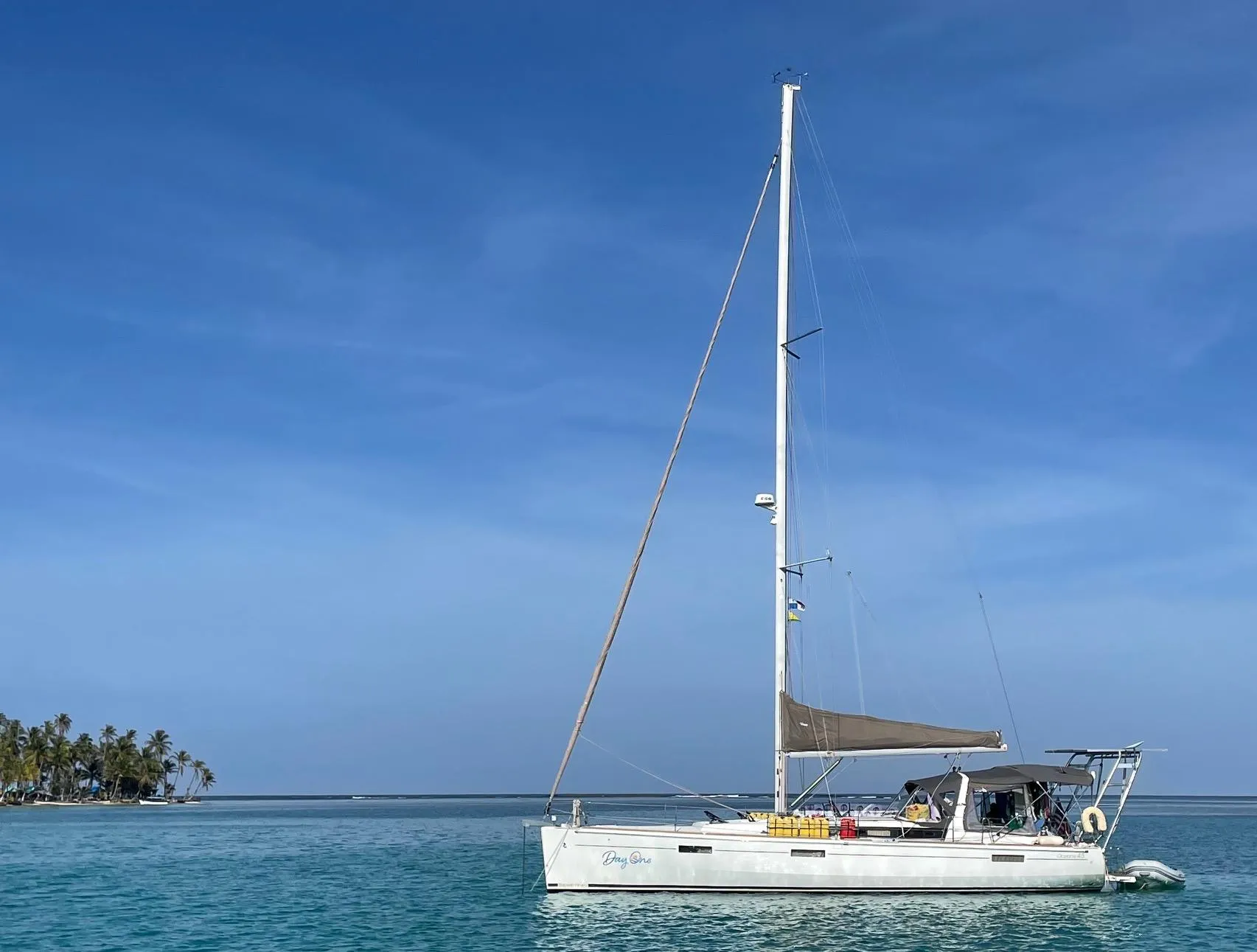 This 2016 three cabin two head Beneteau Oceanis 45 completed a 3 year circumnavigation of the Caribbean. The interior ambiance is warm and spacious and has great scope for personalization. With its traditional Alpi Mahogany cabinetry, the newer neutral tone cushions and curtains, white fabric hull linings, this boat is welcoming and well appointed. In the main cabin forward, the current owners added custom-made storage below the bed. Furthermore the port aft cabin was appointed to be the ‘garage’ where the washer/dryer combo and hardwired additional freezer are located with plenty of space for storing tools and other miscellaneous items.