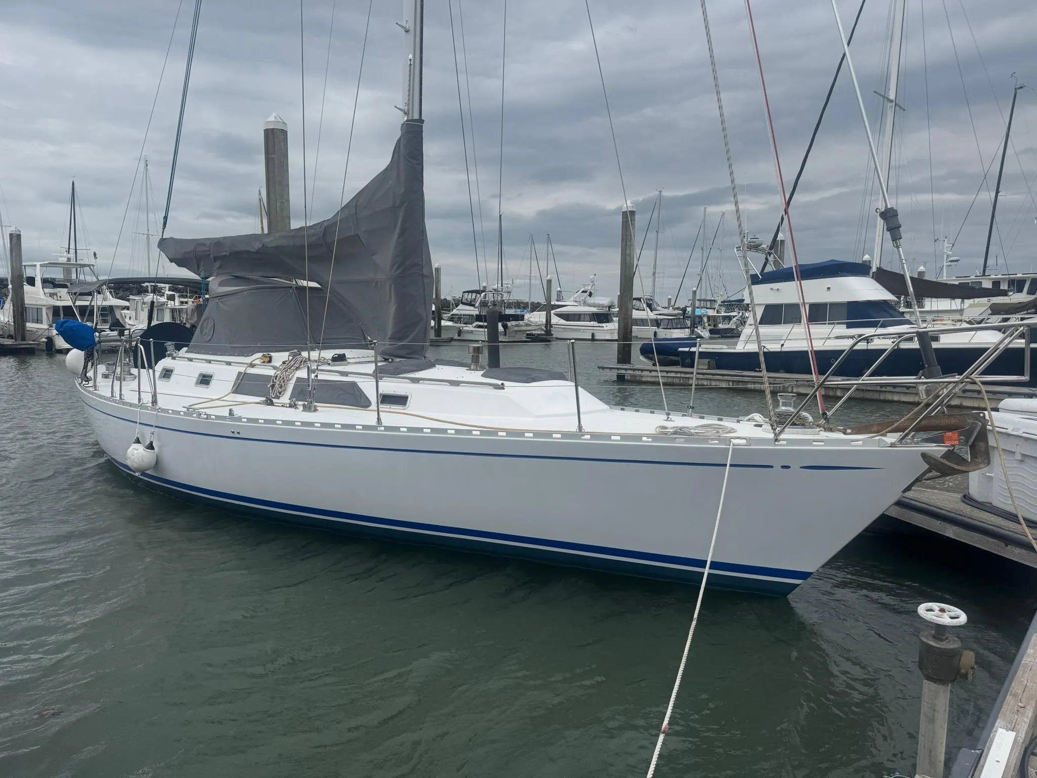 The Hylas 42 Sloop is a remarkable vessel from 1988 that combines elegance with performance. With an overall length of 42.08 feet, this fiberglass beauty features a displacement hull and a fin keel, ensuring stability and smooth sailing. Powered by a reliable Yanmar 4JHTE diesel engine, delivering 55 horsepower complimenting her ease of handling under sail making it perfect for both leisurely cruises and spirited offshore adventures. Accommodating two cabins and one head, the interior offers comfort and functionality for extended voyages. Equipped with an electric windlass, this boat enhances convenience while anchoring. The feathering bronze propeller contributes to its efficiency, allowing for seamless navigation. Dela is a testament to quality craftsmanship and timeless design, ready to take you on unforgettable journeys.