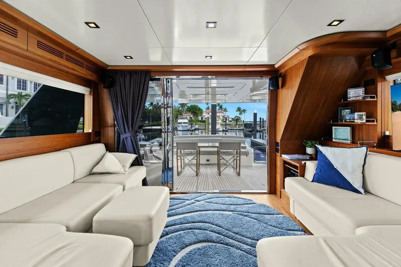 Boarding from the hydraulic swim platform, wide teak steps lead to a generous aft deck with a high-gloss dining table, seating for six, and easy access to both the flybridge and engine room. The open layout flows seamlessly into the salon, creating a bright and inviting space ideal for entertaining or relaxing at anchor.