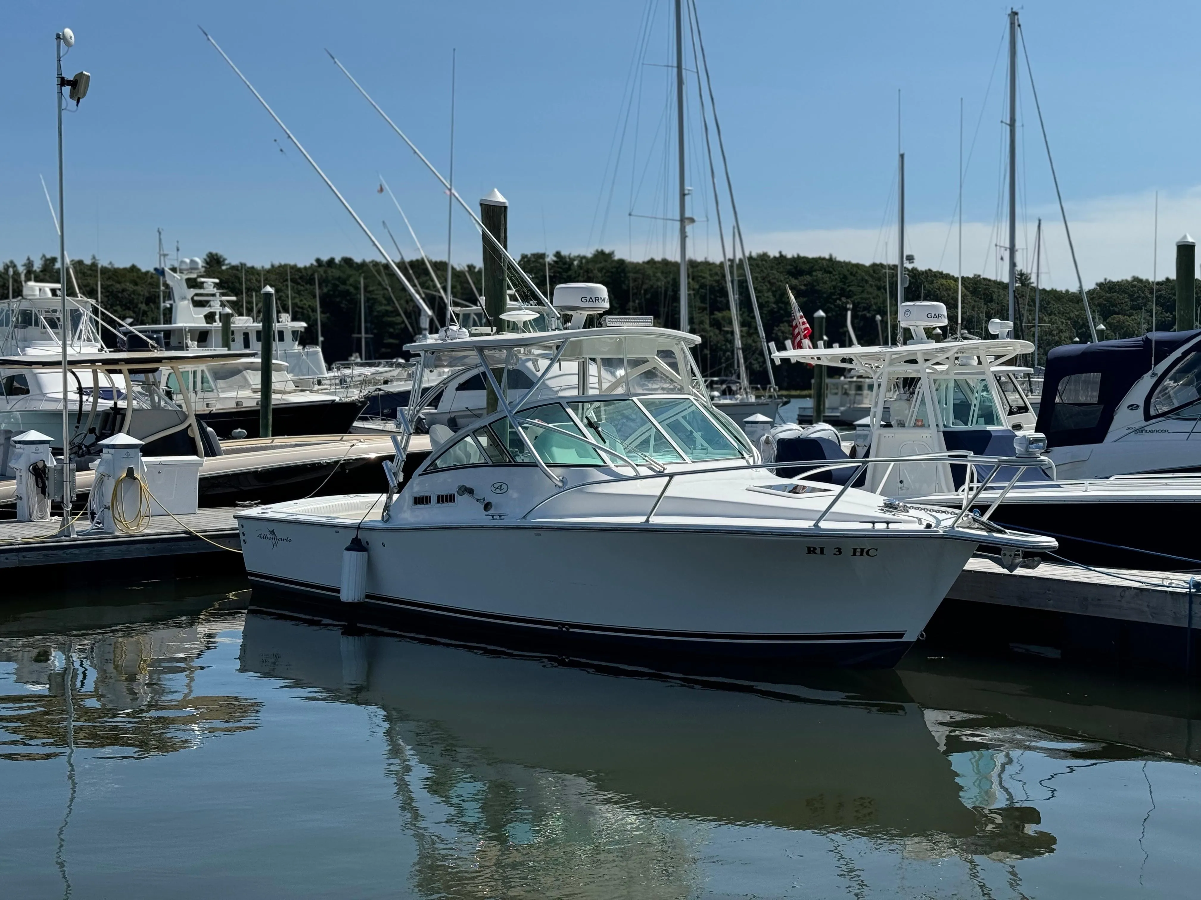 The Albemarle 280 Express is an updated version of the company's popular 27 Express with an updated interior and redesigned deck layout. Heavily built on an aggressive deep-v hull with a wide 9'6" beam, the 280's solid package of hardcore fishing amenities - together with good range and equally good turn of speed - placed her in the leading ranks of under 20-foot sportfishing boats. Features include an integral bow pulpit, (2) in-deck fish boxes, folding rear seat, aft-facing cockpit seat, twin transom live wells / fish boxes, cockpit rod storage, fresh-water / raw-water washdowns, trim tabs, gas-assist engine hatch lift, locking cabin rod storage, cockpit bolsters and gunnel rod holders. Below deck, the 280's roomy teak-trimmed interior includes a teak-and-holly sole, stand-up head / shower compartment, compact galley with refrigerator, microwave oven and a convertible dinette / v-berth forward. Below is a list of some of her features.
