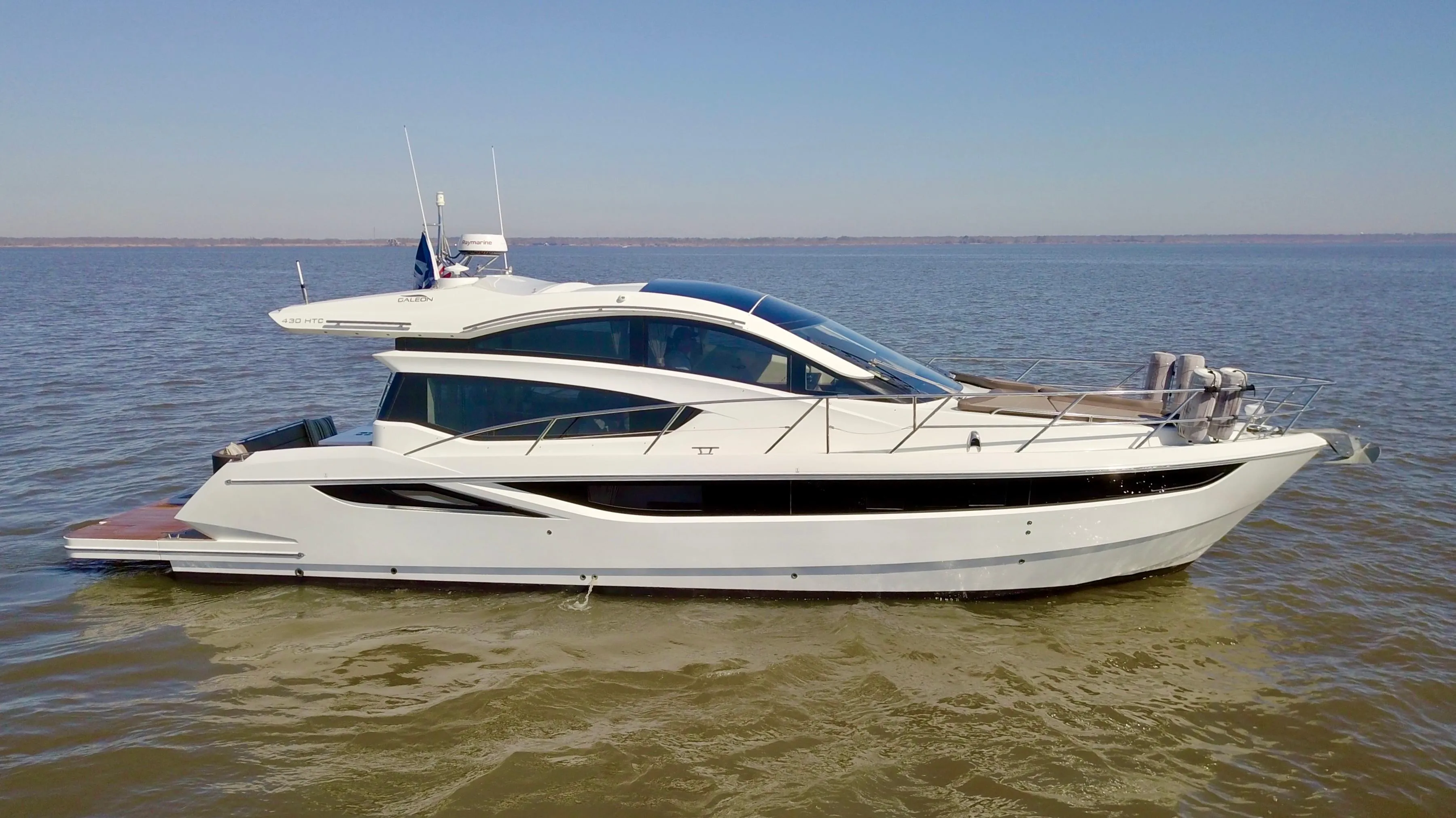 With a line inspired by Formula 1 racing, the Galeon 430HTC provides an interior layout that matches her sporty & dynamic character. The massive hydraulic swim platform provides entry onto the main deck, where you’ll find aft-facing loungers that slide when needed, creating either a great dining or leisure area at the stern. The multi-panel cockpit doors fully open the Salon to the cockpit-patio, providing an open-air feeling throughout. Entering the Salon, you’ll notice the large automatic sunroof that effortlessly slides back, complementing a bright and welcoming interior and ample seating for entertaining family & guests.