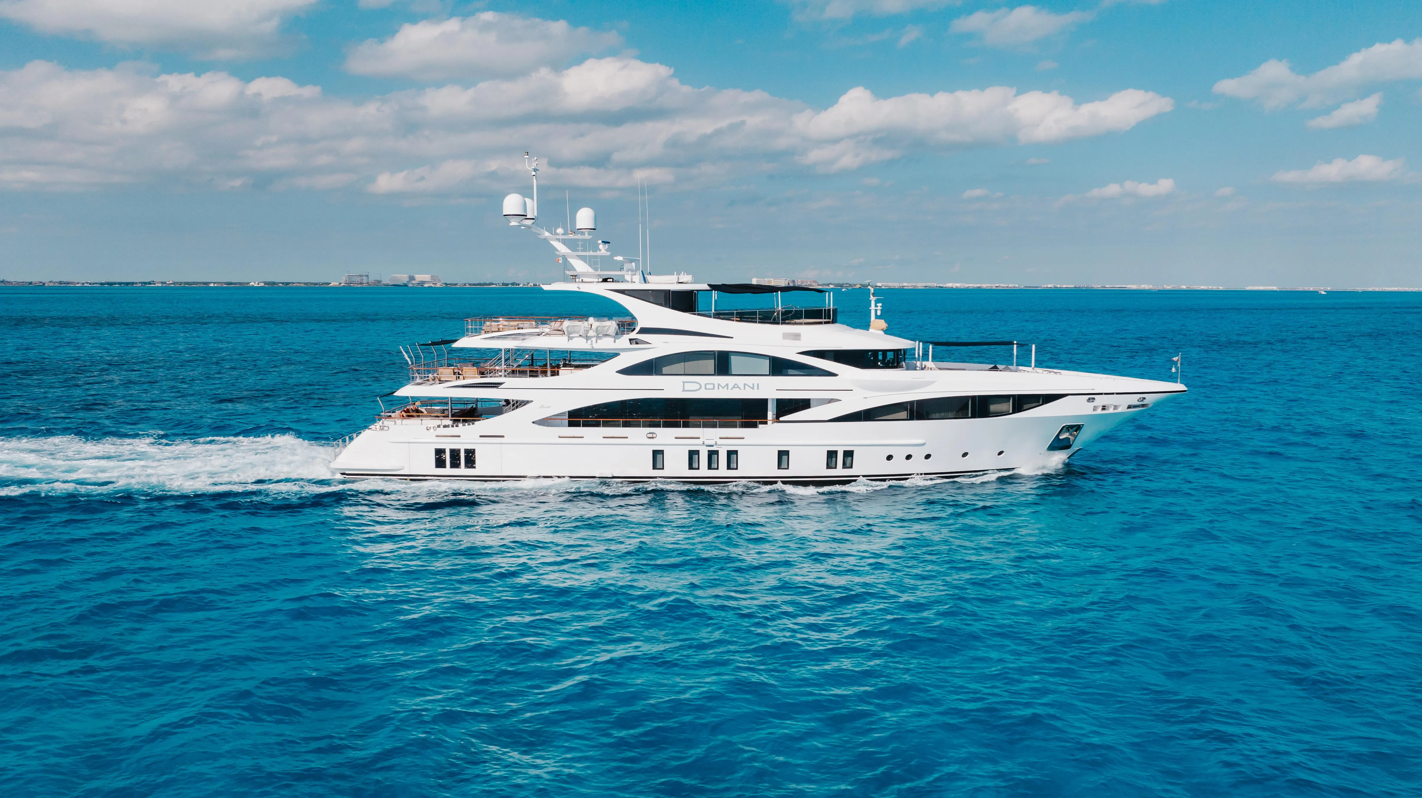 On the main deck, the foyer has a dramatically lit staircase in dark oak and marble with cream leather walls. Large windows and sliding glass doors give the main saloon fantastic panoramic views and flood the charming space with plenty of natural light. The main saloon has a dining area, bar and outdoor games. Easy access is available from the spacious aft deck to the opening beach platform. The nearby beach club has a shower, a day head and even a bar. Domani also has an opening side door for launching tenders and watersport equipment.