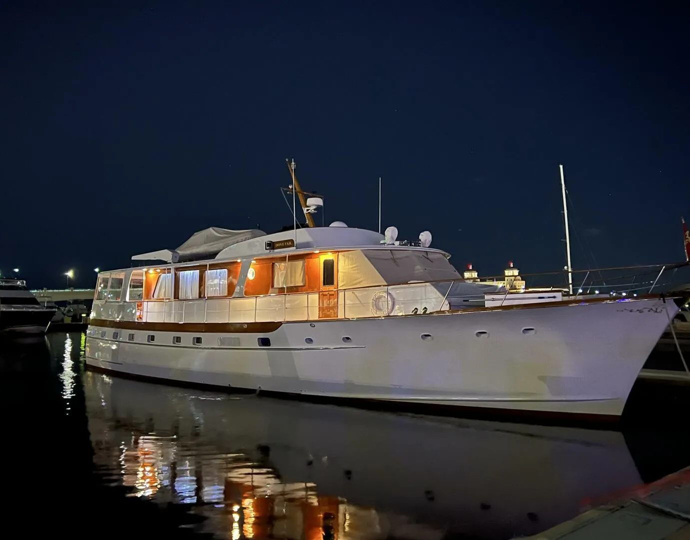 A little history … DOVETAIL was John Trumpy and Sons contract #446 built in 1972 in Annapolis, Maryland as one of the last of the popular “Houseboat” models built. Originally named GERIFAY, she served as Committee Boat for the 1974 Americas Cup Races in Newport, RI.