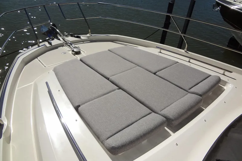 Seating choices include twin adjustable lounge-style sunpads on the foredeck, an L-shaped lounge and table on the aft deck, a relaxing bench to starboard just aft of the helm, and a large lounge/dinette with table to port for those who would dine or relax and enjoy the views forward.