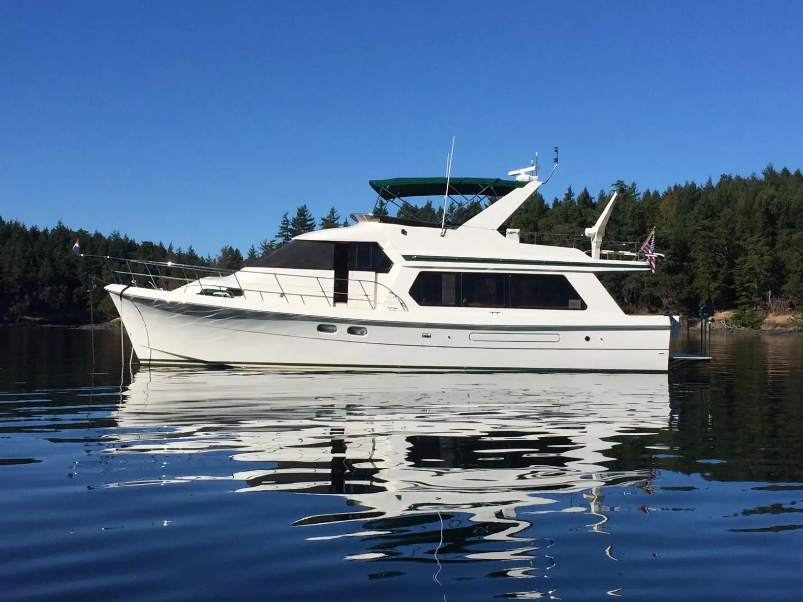 This popular Two Stateroom model has the desirable configuration with two island queen beds with custom mattresses in both and private head with masterflush toilets and shower accessible to each. Beautiful cherry veneers and solids, hardwood floors. Bow and Stern Thrusters are just some of her great details!