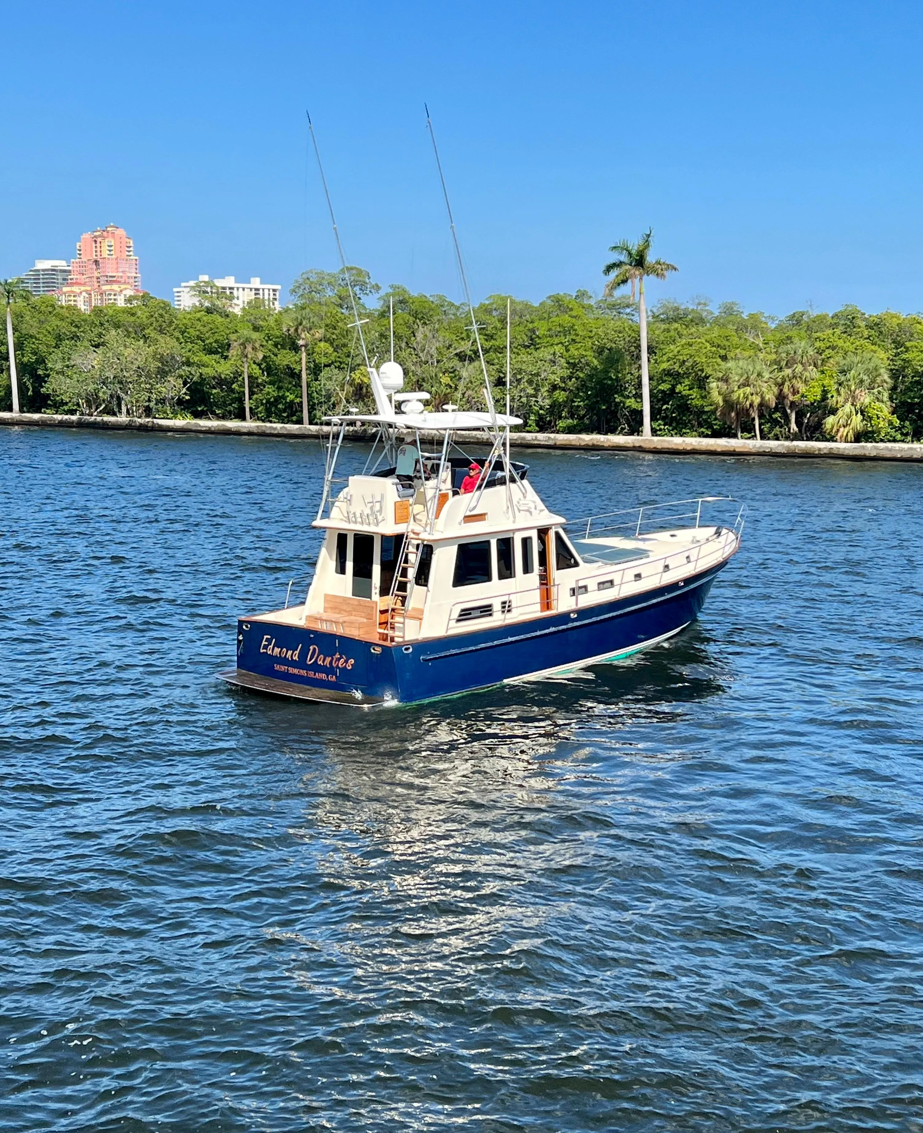 Edmond Dantes Downeast Styling, outstanding performance and state of the art systems will certainly turn heads. She boasts a recent paint job and her vibrant blue hull is beautiful. Her very low hour MAN 1050hp diesels provide exciting performance with cruising speeds in the high 20 knot range and maximum speeds well above 30 knots. She is an excellent sea boat and offers a great ride! Service is up-to-date and 1000 hour service has been completed.