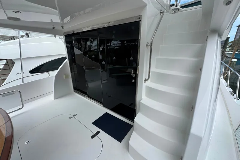 Dynamic Aft Deck. Down from the flybridge, the 135-square-foot aft deck is bigger than those found on many larger motor yachts. A molded, curved settee runs the length of the transom and provides quick access to the swim platform from either side. A second aft deck design eliminates the standard aft bulkhead and instead uses stainless-steel railings and tempered, laminated glass to encase the deck. This arrangement provides more usable space and allows for the installation of an optional passerelle and davit to facilitate Mediterranean-style mooring and dinghy storage on the swim platform.
