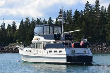 The Grand Banks 42 Motor yacht has been decades in the making.  The original Ken Smith design has been amended and updated with the practical input of her owners. The experience gained since the laying of the first GB 42 keel in 1966 is reflected in each one commissioned today. Her practical layout, study fiberglass construction, deep water design and long range capability all add up to a complete cruising vessel..  The Grand Banks semi-displacement hull design with fine entry forward, hard chines aft and a full keel has been proven on water around the world.  Single or twin diesel power will deliver economy at hull speed and provide higher cruising speeds when larger than the standard engines are chosen. Many power options are available. The exterior of the hull and deckhouse on the GB is smooth gelcoated fiberglass. Teak decking is laid over fiberglass on the main deck and flybridge. The bulwarks surrounding the wide main deck are capped with a sturdy teak safety rail providing movement from bow to stern for those on board. The Grand Banks 42; in production since the 60s, her hull was redesigned in the early 90s  giving the proven Grand Banks semi-displacement hull a longer waterline and an increased beam. Ideal for a couple with children or guests, she cruises economically at 9 knots, yet 17 knots is typical with optional engines. The Motor yacht provides increased living space over the Classic and Europa's, by offering a full-width stateroom aft and two staterooms forward with galley up option, or a galley down option with one forwards stateroom.  The aft sundeck expands the outdoor living area and provides room for storage.