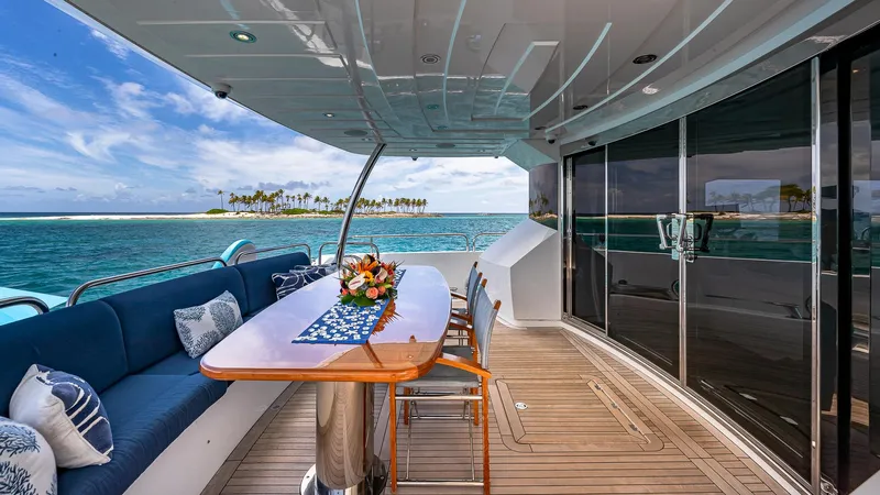 EMRYS provides multiple options for entertaining and relaxation. Guests can enjoy two alfresco dining areas—one shaded on the aft deck and the other located on the flybridge, which features breathtaking views. The flybridge is also equipped with a retractable roof, a 5-person jacuzzi, a bar with three stools, and an oversized sunbed, making it ideal for both daytime lounging and evening cocktails. For those seeking a more private retreat, a second sunbed is located on the bow, offering a secluded spot to unwind.