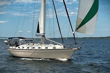 The Island Packet 420 defines Island Packet designs in every aspect, while also representing a significant evolution from earlier models in this size range. With ongoing advances in construction technology, equipment selection, manufacturing processes, and quality control measures, the 420 is one of the most desirable and best built yachts Island Packet has ever offered. The 420 hull incorporates a host of design elements that improve a concept that emphasizes seakeeping, safety, stability, and speed. The bow and stern configurations combine to increase boat speed through a longer sailing waterline and reduced resistance in waves, while refinements to the keel and rudder foil sections benefit upwind performance, reduce drag, and enhance steering. The hull continues to be molded as a one-piece (integral hull and keel) solid tri-axial fiberglass structure, utilizing Island Packet's pressure-fed resin impregnation system, PolyClad 2 gel below the waterline, and DuraShield gel on the topsides. The 420 deck design offers all the key features long appreciated by Island Packet owners: recessed foredeck with bulwarks, anchor platform with two rollers (the exclusive SeaSafe patented design), full-length stainless steel cabin top handrails, beautifully molded detail for hardware, an improved dodger - windshield mount, and Dorade vents with stainless steel cowls and welded guards. The cockpit offers long, contoured seats with big lockers under push-button latch seat hatches with gas support struts, an insulated beverage box, hand-held shower, separate helm seat with backrest and premium rack and pinion pedestal mounted steering (with provision for auto pilot), molded stern rail seats, and a central gate leading to a stern platform. As always, sail control lines are led aft making sail trim or changes convenient from the cockpit. Bins located at the forward end of both coamings have hinged tops and provide handy and neat storage for these lines. With the available option of a roller furling mainsail, sailing has become easier and more enjoyable than ever. It's a real pleasure to be able to quickly set, trim, or stow the sails without leaving the cockpit. While on the subject of the rig, the Island Packet 420 has been created with a somewhat taller configuration to take advantage of her extra sail carrying ability and to enhance both light air and upwind performance. The contributions to performance and sail control from the Hoyt staysail boom would be hard to overstate. This simple device has "turbo-charged" the staysail's contribution to overall performance and makes the cutter rig better than ever. The 420 should have excellent qualities for cruising under all points of sail in a wide variety of conditions with a very manageable and versatile rig. Perhaps the most exciting aspect of the Island Packet 420 is the interior arrangement. The beam of over 14 feet and a lot of usable hull length, have enabled Island Packet to create very spacious accommodations with all the amenities that owners are looking for, along with lots of storage space and large tank capacities to meet the demands of extended cruising. The owner's quarters are located forward and include a private head compartment with stall shower. The stateroom introduces an arrangement with a large double berth offset to starboard and angled away from the hull side to allow access from either side. The berth top is hinged and supported with gas struts and may be raised to access a generous storage bin underneath for blankets and the like. Additional drawers, bureaus, shelves, and a cedar lined hanging locker provide ample room for personal items. A dressing seat adds further convenience, and two deck hatches, a Dorade vent, and several opening ports will keep this area bright and breezy, as are all other areas throughout the interior. The adjoining head has a sink vanity with cabinet space over and under, "captain's-chair" seating for the toilet, and built-in medicine chest and linen drawers. The shower includes a molded seat and folding textured acrylic door that stows flat against the bulkhead when not in use. Space (and access) has been provided for owner - dealer installation of a bow thruster under the shower seat area. The big forepeak is reached through a tall bulkhead door in the shower area. This area is unique in that it features Island Packet's usual divided chain locker forward (prepared for windlass installation and chain control), plus a separate area immediately aft that will be handy for storage of items like fenders, extra anchors, and rodes, etc. when underway. The aft guest stateroom has a wide double berth, ample storage in a hanging locker and bureau, and private entrance to the aft head compartment. The aft head may also be accessed from the salon area, and includes a shower with curtained enclosure and folding seat over the toilet. The sink vanity has cabinet storage over and under and, as with the forward head, is finished in light colored Formica laminates with varnished teak trim for an attractive, bright, and practical finish. Shower drains in both heads have an electric drain pump discharging overboard, with sole drains configured to work at rest or under sail. The main salon is notable for its overall spaciousness. Once again, the popular arrangement of full-length, facing settees is incorporated, with the starboard L-shaped settee able to convert into a double berth with a pull-out extension. Island Packet's trademark folding dining table hinges from the bulkhead storage rack to provide for either a large serving - dining area or, when retracted, a completely open salon. Large storage areas are available under and behind both port and starboard settees, in cabinets outboard, and above the settees, and in a cedar lined hanging locker. Large capacity tanks for water, fuel, and waste are located under the sole, keeping these considerable weights low and close to the center of the yacht to maximize stability, minimiz