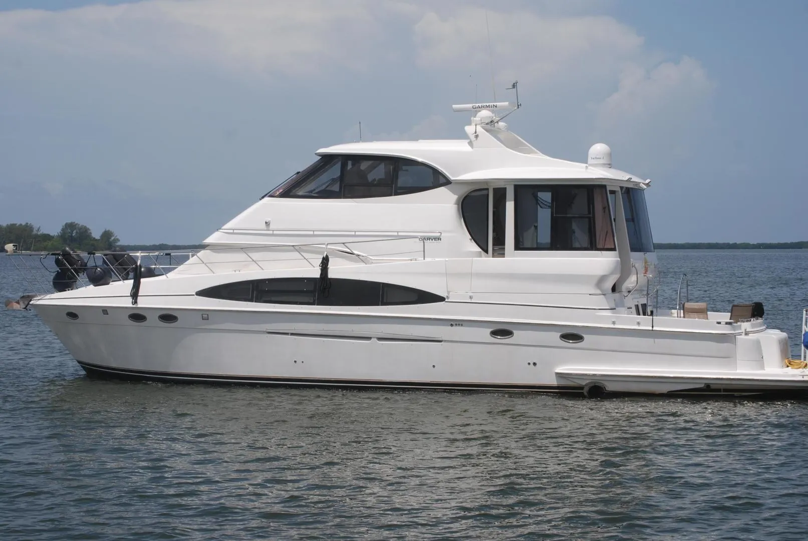 The forward leaning fiberglass arch, hard top, full glass forward windshield, and clean style lines running from the bow to the trailing end of the swim deck provides the classic and timeless appearance that Carvers are known for. This is one great looking boat!