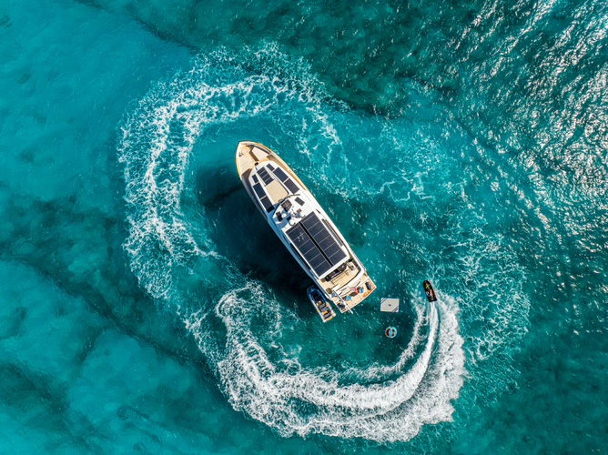 Onboard comfort is further enhanced by the latest-generation electric fin stabilization system, providing exceptional stability both underway and at anchor. The extended flybridge hardtop is equipped with a comprehensive solar energy package and an impressive 80 kW lithium-ion battery bank, forming the Silent Package that allows for silent overnight operation without generator use.