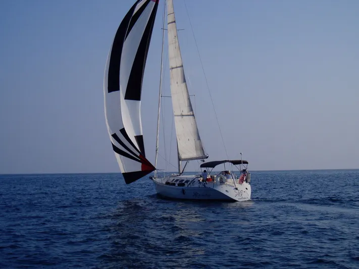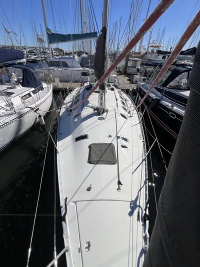 This well-appointed yacht features a spacious cockpit and thoughtful deck layout that make sailing easy and enjoyable for both experienced sailors and weekend cruisers. The hull and deck configuration provide excellent stability and balance under sail, while the fractional rig offers responsive performance in a wide range of conditions.