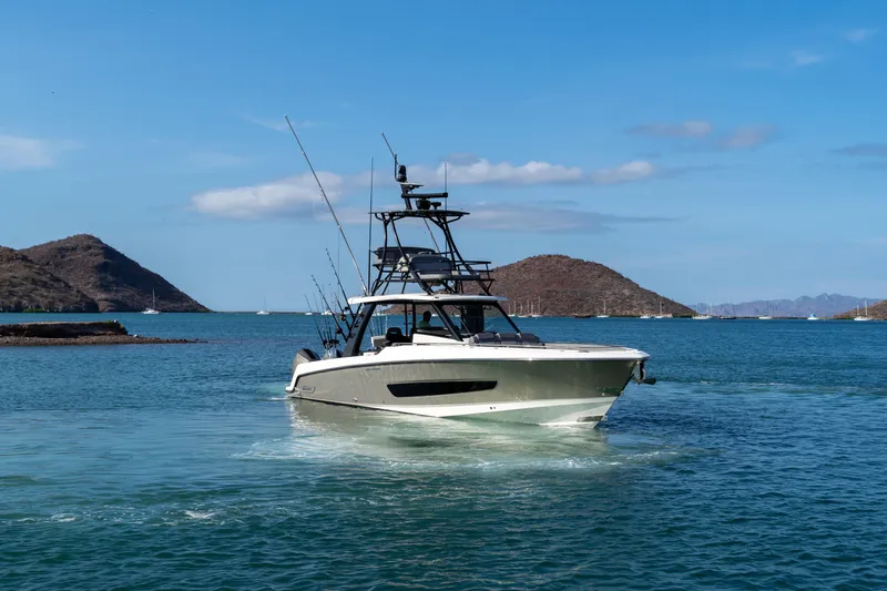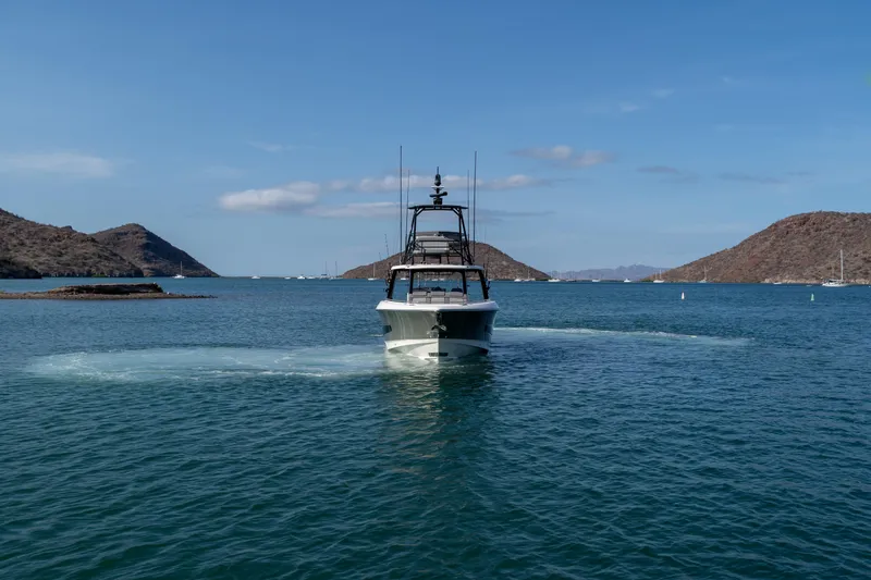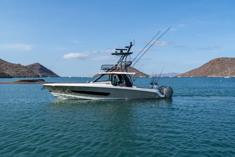 FAST KASH is a 2023 Boston Whaler 420 OR powered by three Mercury TR-600 JPO V12 engines, each producing 600 horsepower, delivering robust performance and advanced handling.