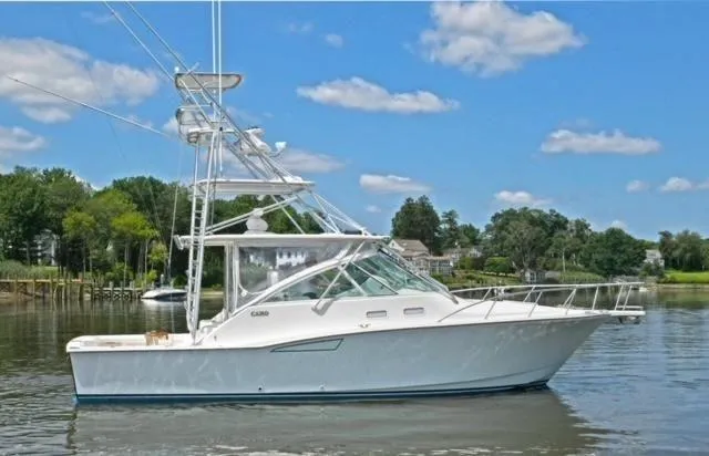 The master is an offset double berth forward with a seating area and cedar lined hanging locker to starboard. There is a ventilation deck hatch with a screen and shade. Rod storage for (8) rods is above port and starboard. Aft to starboard is the L-shaped dinette area that converts to upper and lower berths. Aft to port is the spacious galley area with Corian counter tops, AC/DC refrigerator and freezer, convection/ microwave oven, molded-in sink and dual burner cook top. Aft again to port is the head compartment with a Sealand VacuFlush electric toilet system, sink, vanity and mirror. The separate stall shower also accommodates rod storage. The cabin interior wood is teak with a satin finish with the cabin sole Teak & Holly. The cabin headroom is 6'11'.