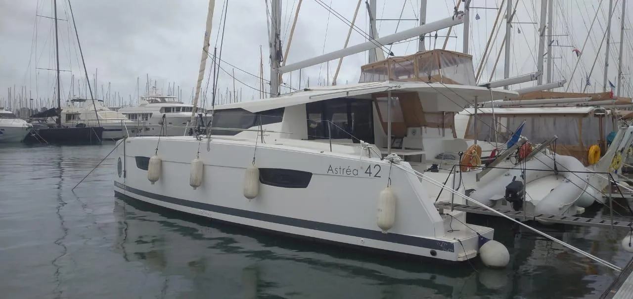 By inventing the Astréa 42, Fountaine Pajot Sailing Catamarans reaffirms its ongoing commitment to build and innovate based on its experience. The Astréa 42 builds on the strengths that have made the Saona 47 so successful: its inverted bow stands out as the trademark of the series. This innovative feature sketches out an elegant and dynamic silhouette, while creating stunning volumes inside the boat in spite of a relatively small overall size, with a mere 12.58 metres in length.