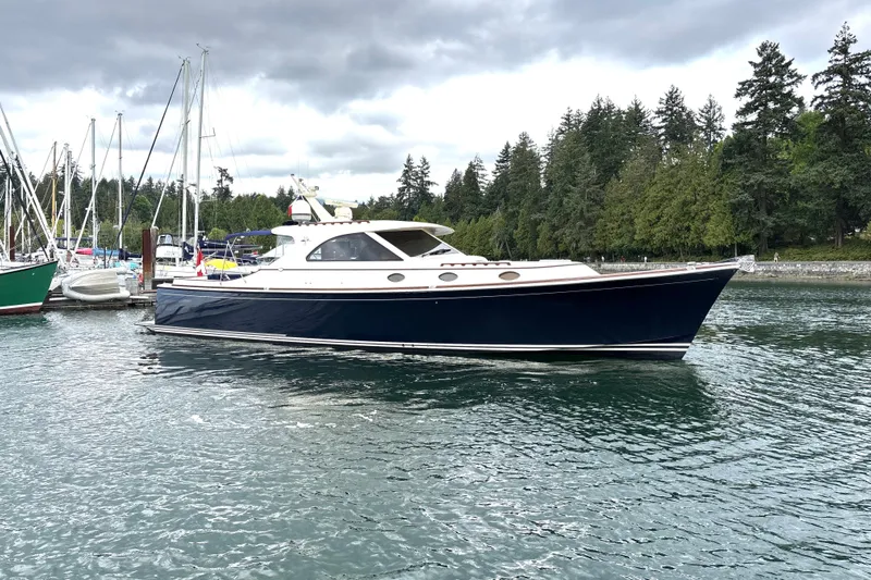 The SJ48 hull has a traditional flared bow with fine entry and tumble home aft, complemented by her hydro-dynamically efficient underbody. The SJ48 hull is formed using a Kevlar/E-glass and Corecell foam core composite vacuum infused with vinyl ester resin. Dupont Kevlar/E-glass hybrid is used to greatly increase the strength of the hull against damage caused by impact. Her resin infusion process yields strong lightweight parts with high glass to resin ratios. The core is removed and replaced with solid glass and extra laminations in areas of major penetrations and high stress. Watertight structural bulkheads separate the hull into damage control zones with dedicated bilge pumps. Structural bulkheads are built using Corecell foam core with E-glass skins infused with vinyl ester resin. Longitudinal and transverse stringers are an E-glass PVC and Corecell foam core composite. The swim step is built using Corecell foam core with E-glass skins infused with vinyl ester resin. The walking surface of the swim step is teak. The swim step is fastened to the hull using stainless steel fasteners and three custom stainless steel struts for support. The entire structure of the boat is built using wood free composites. All exterior teak trim is finished to a high gloss using multiple build coats of UV inhibited epoxy and multiple coats of Imron clear acrylic providing an extremely hard, low maintenance finish. The deck and superstructure are hand faired to the highest industry standards and are painted with Imron paint. The hull is painted with Alexseal paint. There is a double boot stripe painted.