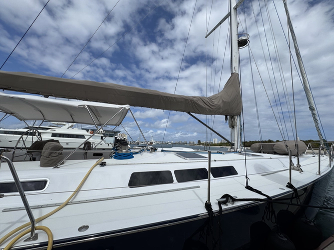 FORTUNATO features sleek hull and deck lines, a secure center cockpit, wide side decks, and generous fore and aft deck spaces that make movement around the boat safe and comfortable. Most running rigging leads aft to the cockpit, allowing for efficient and confident short‑handed sailing.