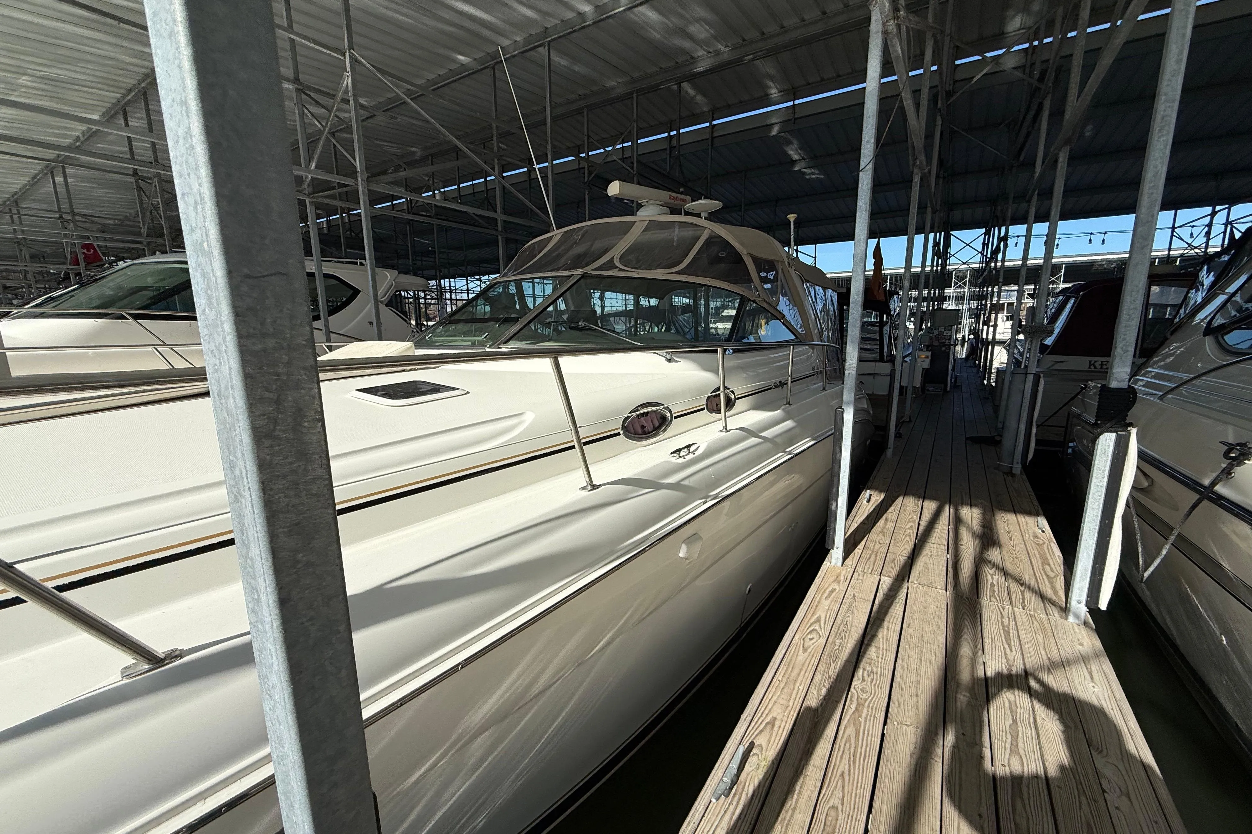 Aggressive Sea Ray styling. High build quality. Great accommodations. Well appointed interior with Cherry Cabinetry, upscale decor, with private forward stateroom. Built-in entertainment center. Corian galley counter. 10 foot salon sofa. Mid-stateroom lounge converts electrically to a double berth. Spacious cockpit with wraparound seating has full wet bar, fender storage. Large swim platform with ladder. Has an aftermarket hydraulic tender lift. Has snap in woven flooring in cockpit and swim platform. Separate shower in head compartment. Convient area close to Chattanooga airport. Easy to show listed by exclusive broker in gated Marina.