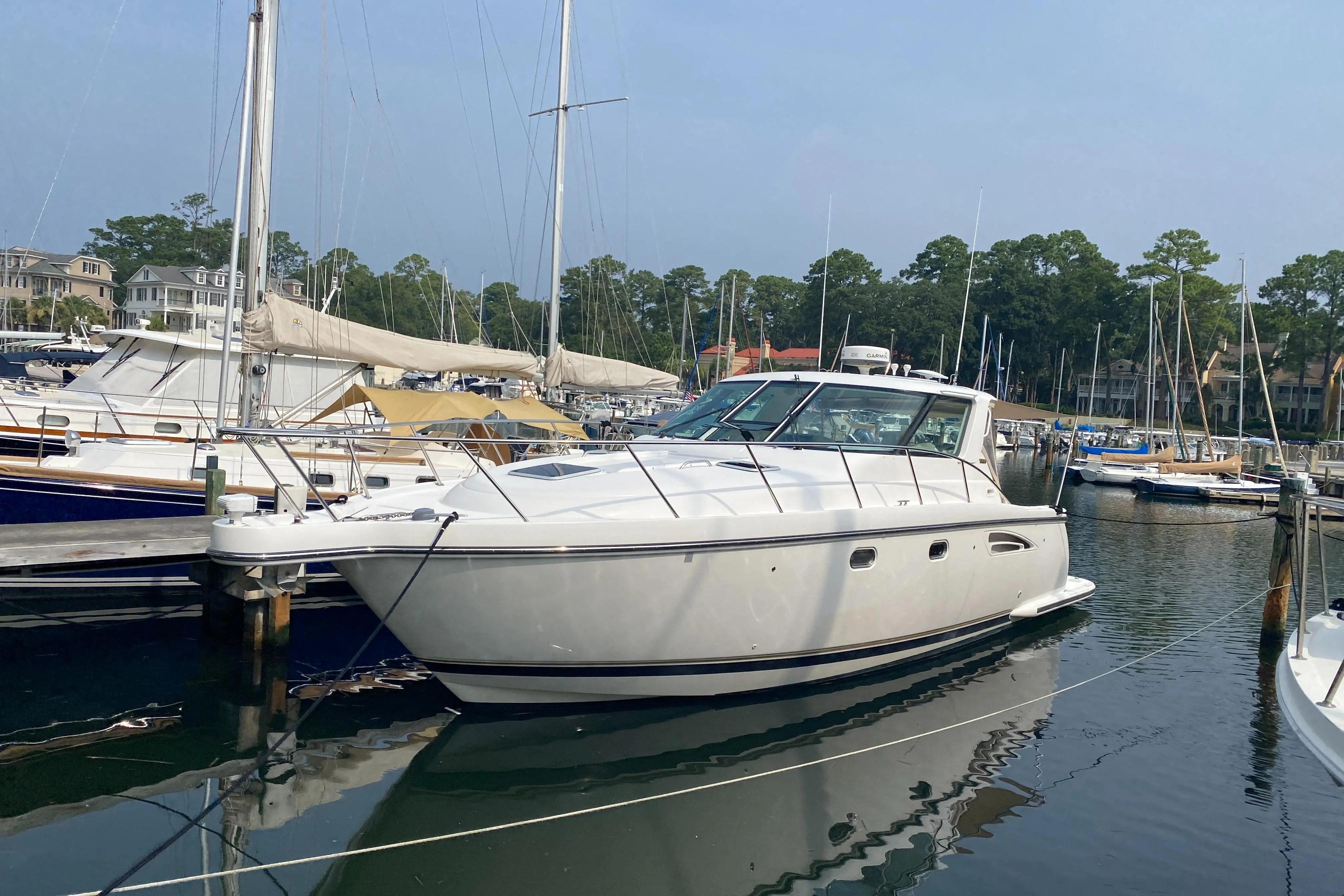 The Tiara 3600 Sovran is a spacious yacht with a roomy dinette, starboard galley, and forward owner's suite. It has a fixed fiberglass hardtop with an integrated arch and fiberglass windshield frame.