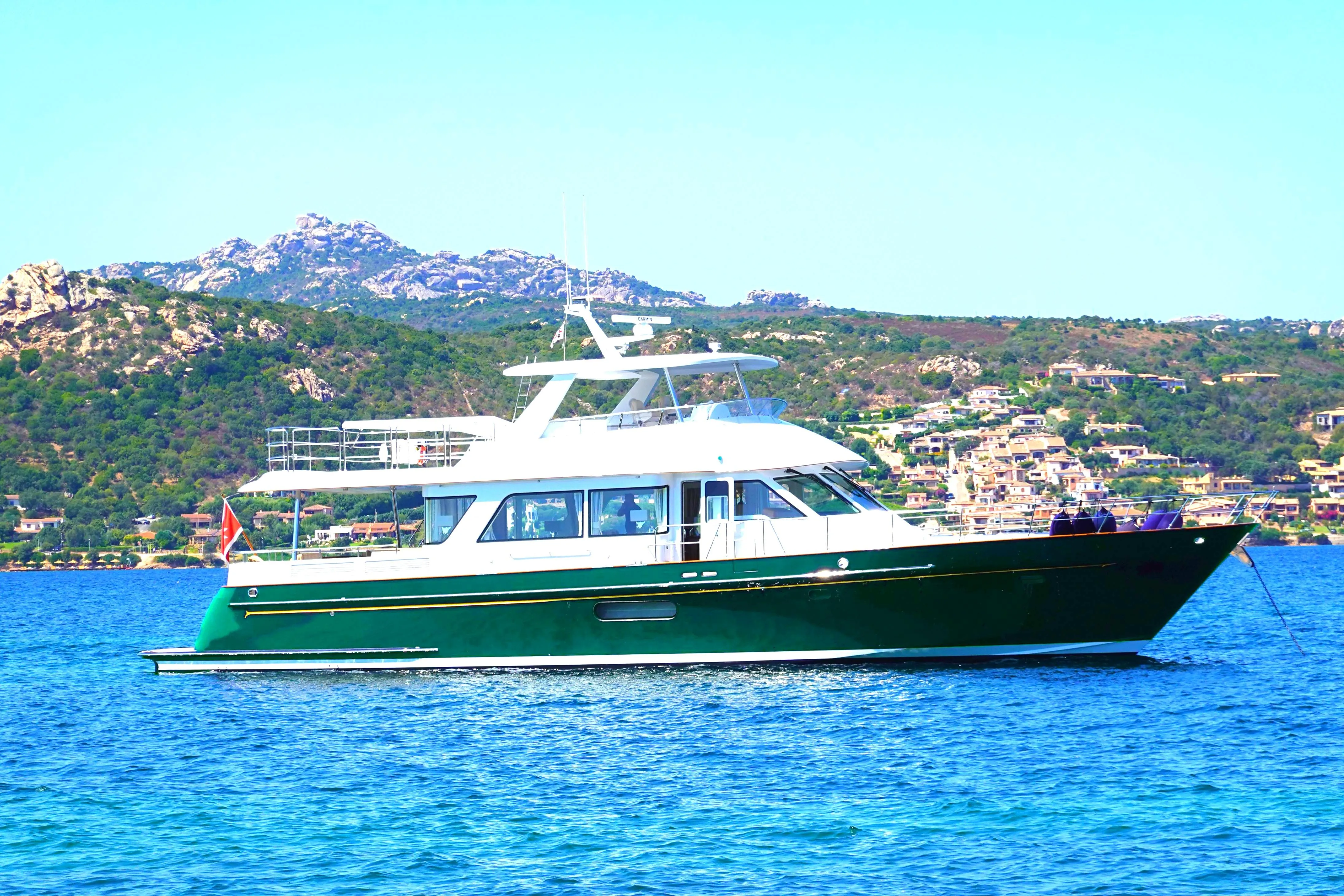 Her exterior combines classic styling with smart functionality. The flared bow and teak decks, accented with stainless steel and light grey caulking, give her an effortlessly polished look. The aft deck is spacious and inviting, ideal for outdoor dining with its adjustable teak table and armchairs. Up top, the flybridge is equipped for both relaxation and function, featuring a dual helm station, U-shaped seating, a fridge, ice maker, and a crane for launching the Williams jet tender. The foredeck adds extra space for lounging or sunbathing, whether you’re anchored or underway.