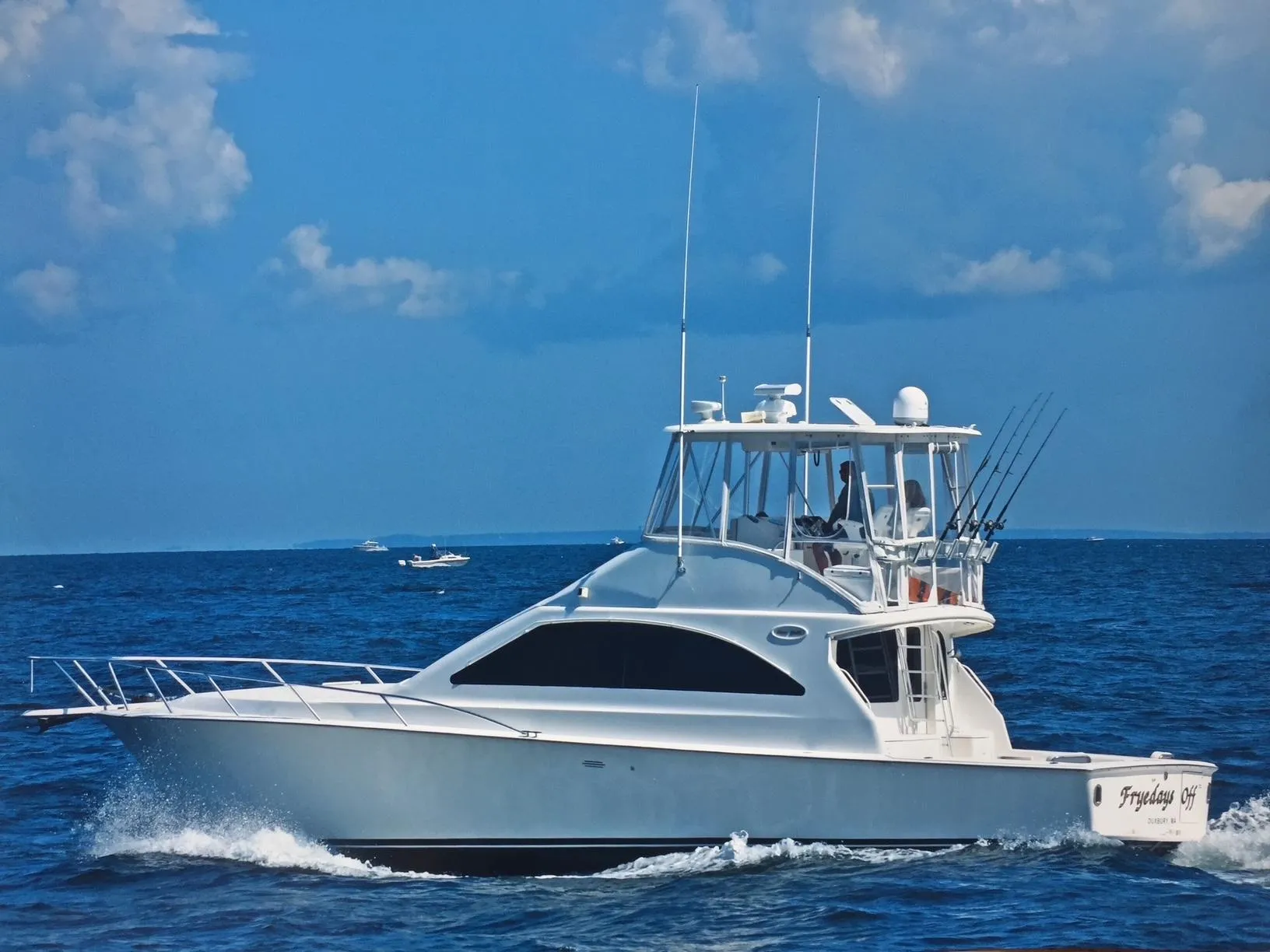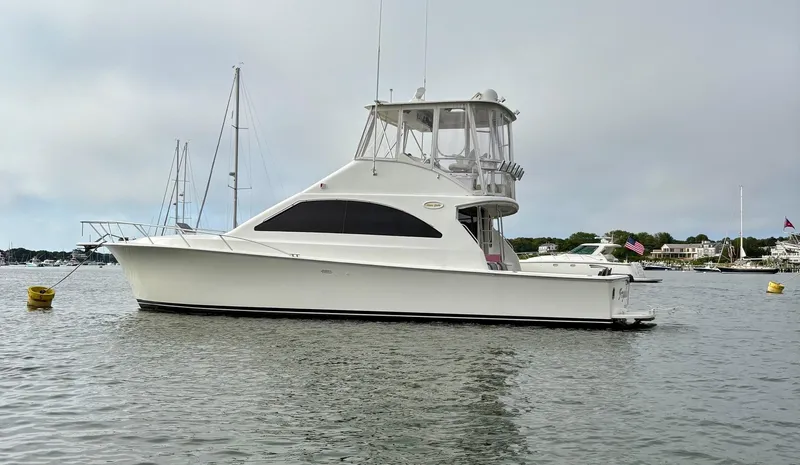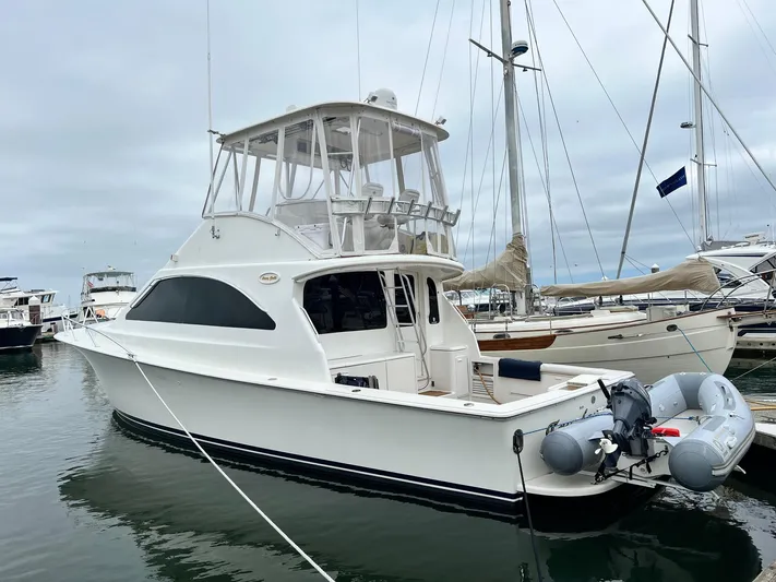 "Fryday's Off" is a Sleek 43-footer with a large fishing/cruising cockpit, lush accommodations deliver lots of bang for the buck. Innovative two-stateroom, two-head floorplan with deckhouse galley. Sleeping 6 with master suite is forward with a portside thwart side walk-around queen berth, guest stateroom is aft with twin berths and a pull-out salon convertible settee. Large cockpit with engine room access, tackle center with freezer, transom live well, large in-deck fish box, and flybridge hardtop with full enclosure. One of the cleanest engine rooms I have seen, Aqua Tractraction cockpit and flybridge deck installed in 2024. The Hard Bottom Raft is available at an additional Cost.