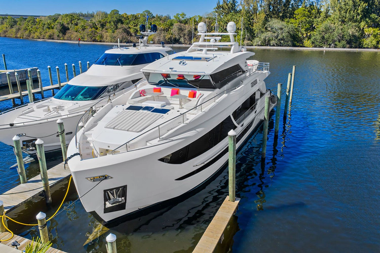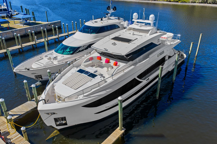 GENESIS, the 2020 Horizon FD87 represents the cleanest FD87 on the market today and offers amenties not typically found on a 90fter such as a true designated beach club with full service bar, lounge area and kitchen located back aft on the main deck.