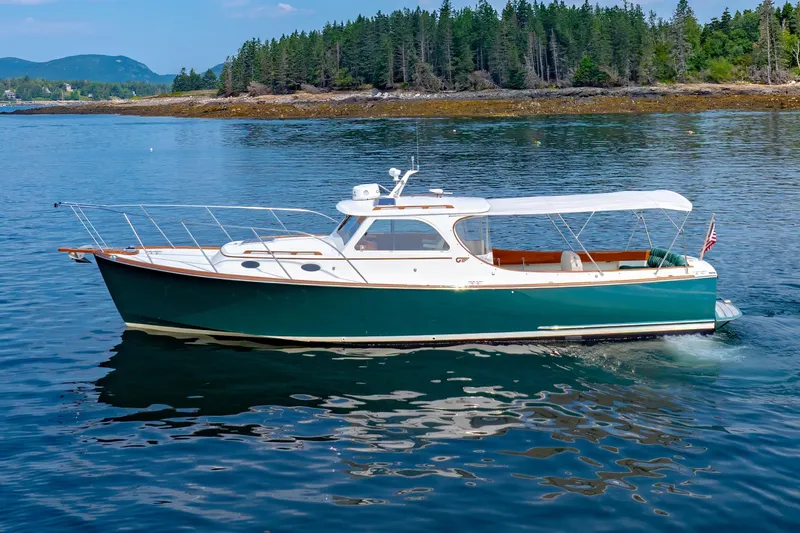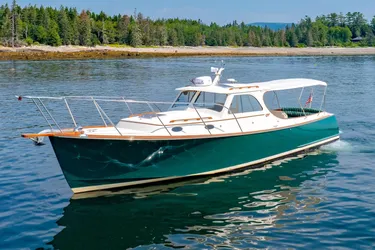 Hinckley’s Picnic Boat Classic combines traditional aesthetics in her beautiful lines and stunning craftsmanship with modern design and materials. GENIE is well appointed with shallow draft waterjet propulsion and Hinckley proprietary JetStick control system enable effortless and elegant entertaining, day cruising, or weekending. The transom door is an especially rare feature; there are less than a dozen 36 Classics so equipped. GENIE features an open and comfortable pilothouse and cockpit, with ample deck space and seating. Below in the air-conditioned cabin she sleeps two comfortably and offers amenities including galley and head with shower.