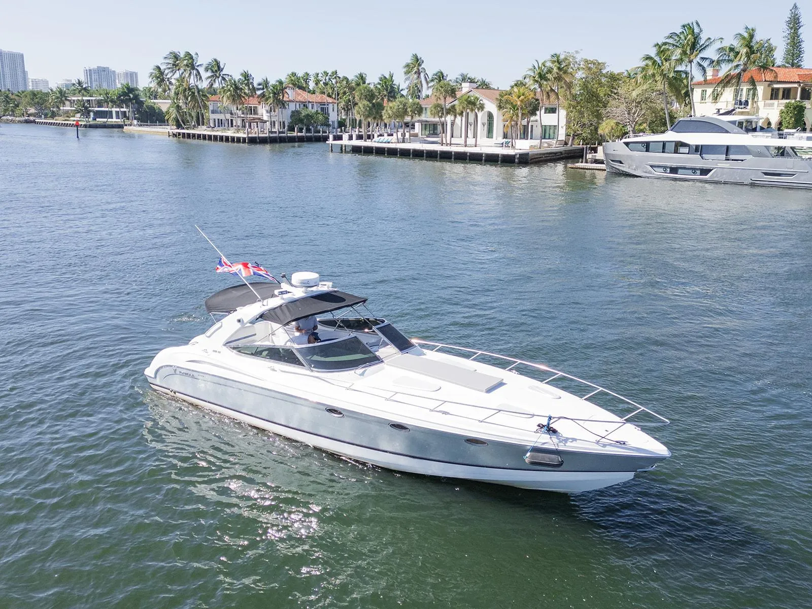 At 40 feet in length with an 11ft beam, this 400 SS centers on performance and space that allows you to enjoy all that boating was meant to be. The large floor plan allows guests to move around unconfined from the expansive bow to the double seating helm to the wet bar, U-shaped lounge aft, swim platform and very large cabin with full head.