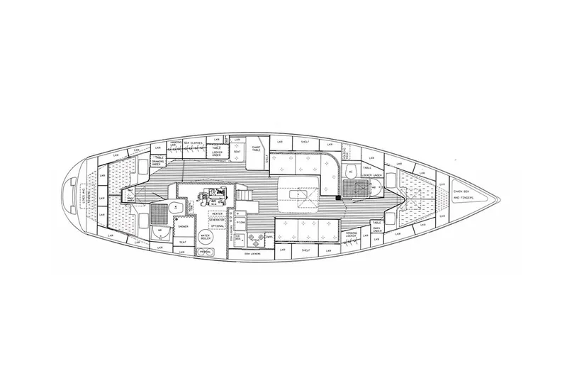 The storage capacity on the HR42F is remarkably generous and well-organized. The vessel features 4 sail bins, 3 hanging lockers, 7 louvered-door drawer or shelf sets, and 22 louvered-door lockers. Additionally, there is full-length shelved stowage behind the port settee, deep stowage for paper charts beneath a large chart table, and large sliding-panel shelved stowage in the galley. The interior is rounded out with 6 stowage lockers in the heads, 9 special-purpose and access lockers, and 4 deep bookshelves.