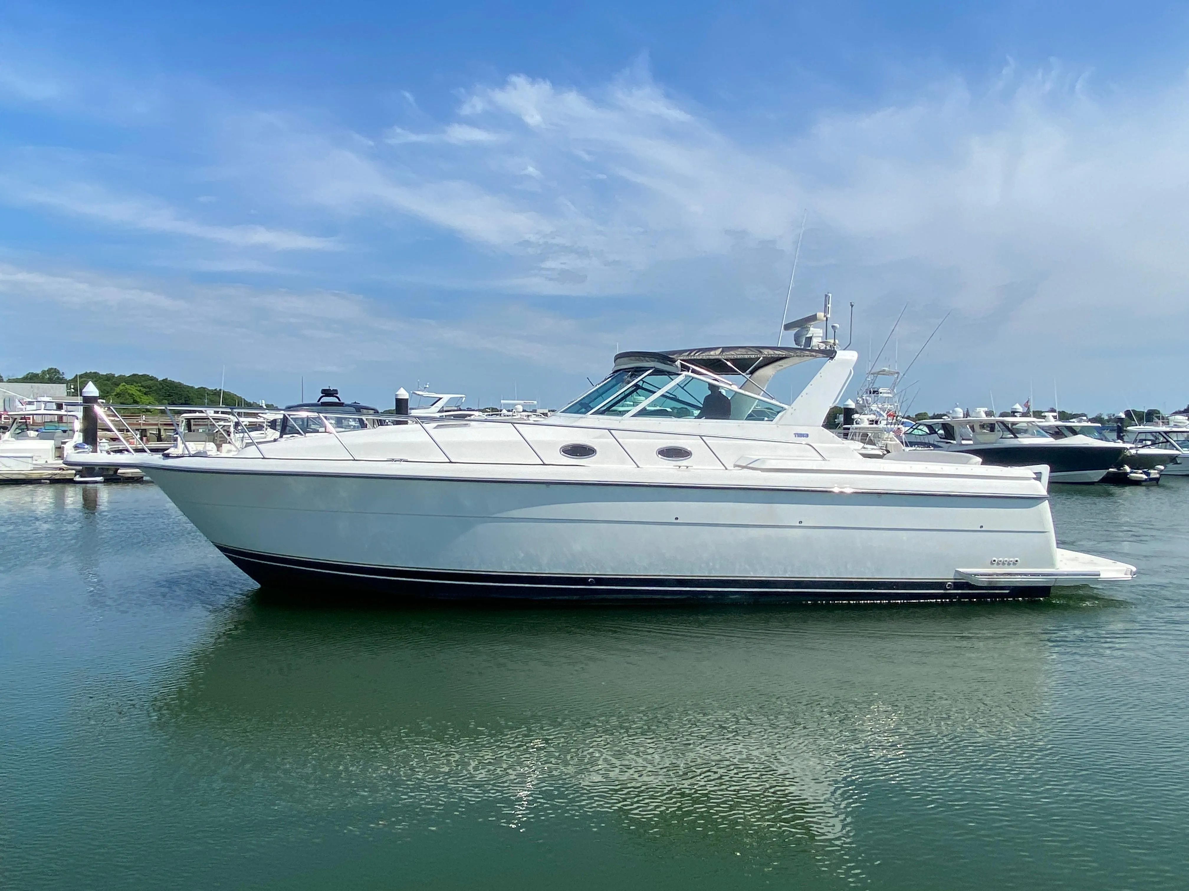 The 4000 Express combines styling and performance with traditional Tiara standards and a reputation for rugged dependability and sea-keeping ability. GET HOT is a lightly used yacht on only her third knowledgeable owner who has taken exceptional care throughout ownership.  The desirable Plan A aft-cabin floor plan features two staterooms & two heads.  She also boasts an 11 foot convertible starboard settee in the salon with removable pedestal seats and dining table to comfortably sleep 6 total.  The cockpit offers truly social seating for entertaining the entire family - with an electric double-wide helm seat, abutting companion seat, aft-facing lounge, and an oversized rear lounger. The upgraded low hour 450HP Cummins 6CTAs are accessed through a concealed hatch in the aft-facing lounge, and can also be accessed by lifting the main engine hatch with a touch of a button.  Also featured is a complete galley, private owner's stateroom with queen-size pedestal bed, head with a separate enclosed full sized shower, and a private aft-cabin stateroom (with head). The transom trunk can stow bikes and dive equipment and makes this cruiser the ideal boat for extended trips to the Cape and Islands, Maine, the Great Loop and beyond.